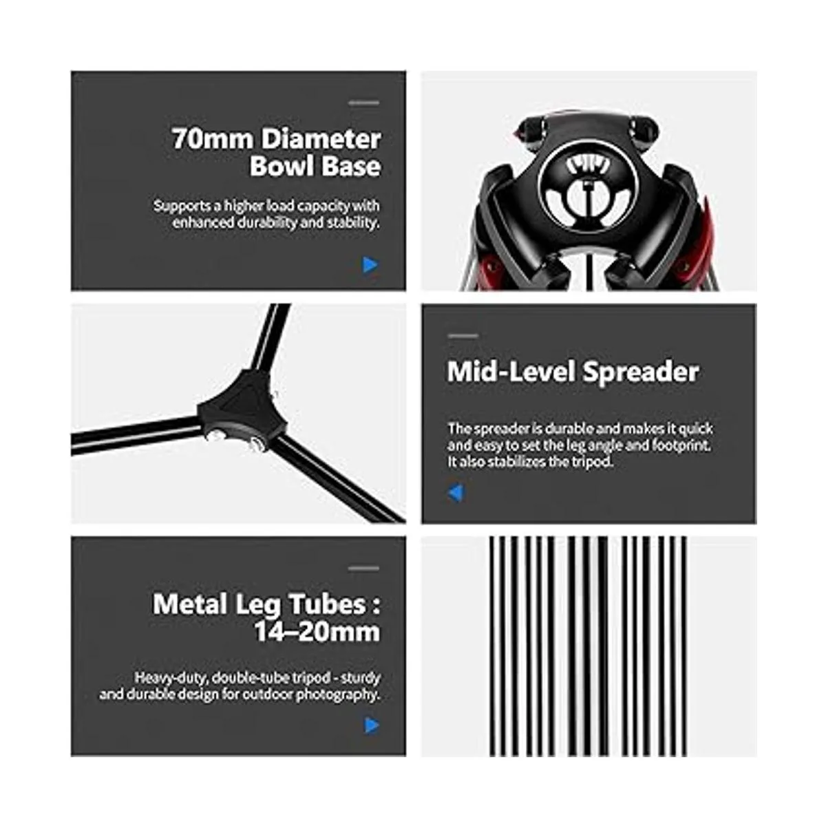 Trípode de aleación de aluminio resistente: este trípode de doble tubo de aleación de aluminio es resistente y duradero para su uso en diferentes entornos de disparo. La base del cuenco de 2.756 in situada en la parte inferior del cabezal del trípode se puede ajustar para mantenerlo estable en la mayoría de superficies, satisfaciendo las necesidades de disparo de viaje al aire libre