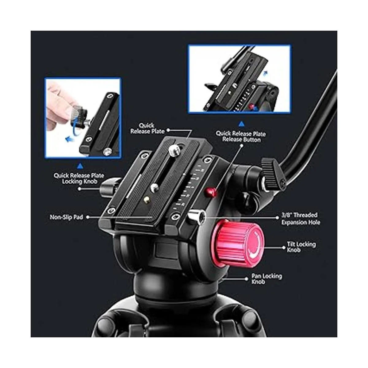 Tornillos estándar de 1/4 pulgadas y 3/8 pulgadas: la placa de liberación rápida grande con tornillo de 1/4 pulgadas y 3/8 pulgadas es compatible con Canon Nikon Sony y otras cámaras DSLR y videocámaras