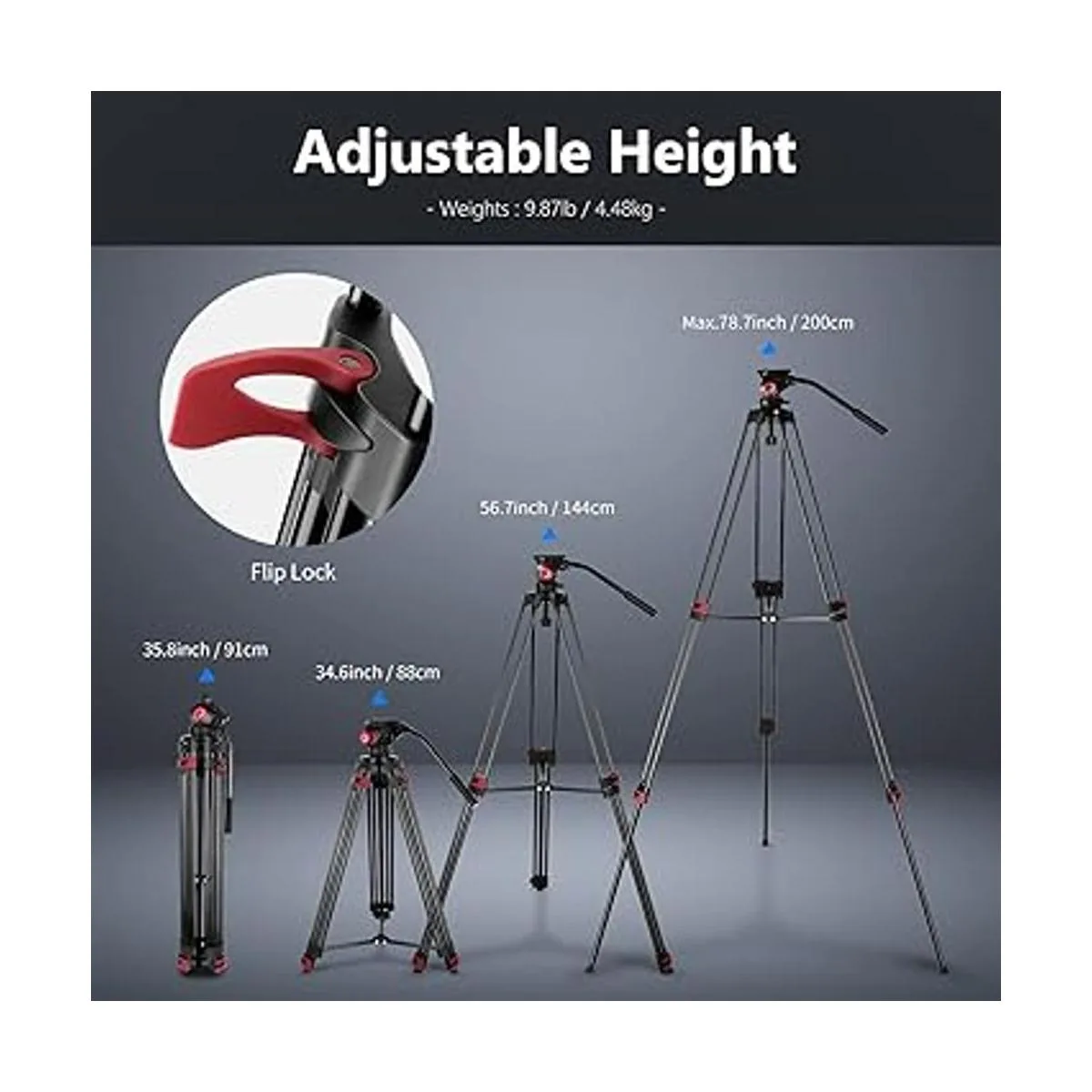 Altura ajustable y fácil de transportar: los fuertes cierres abatibles permiten al usuario extender y asegurar cómodamente y fácilmente las piernas. Utiliza este mecanismo de bloqueo para ajustar la altura del trípode de 34.6 in a 78.7 in. Dobla el trípode hasta 35.8 in y guárdalo en la bolsa de trípode incluida para un fácil almacenamiento y transporte