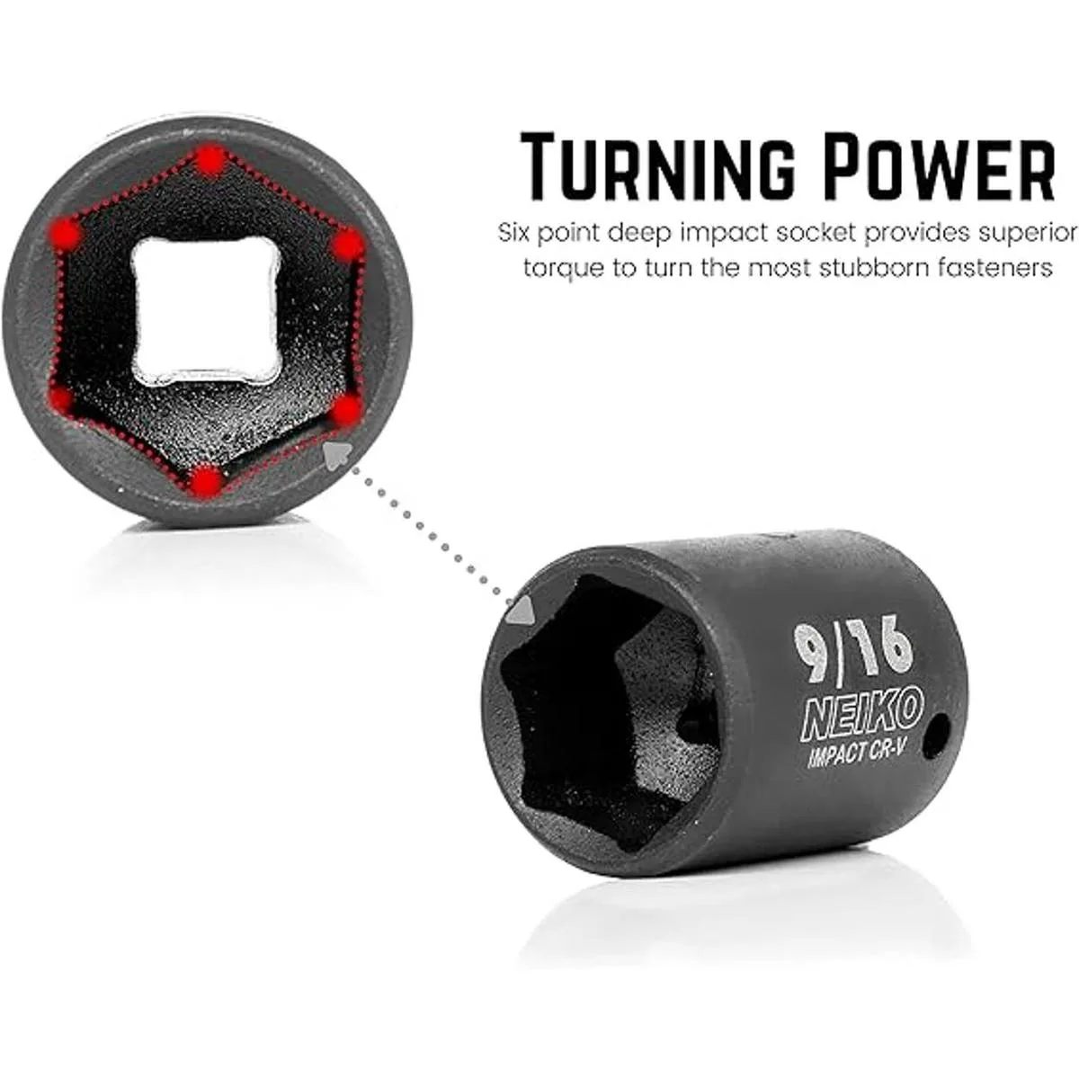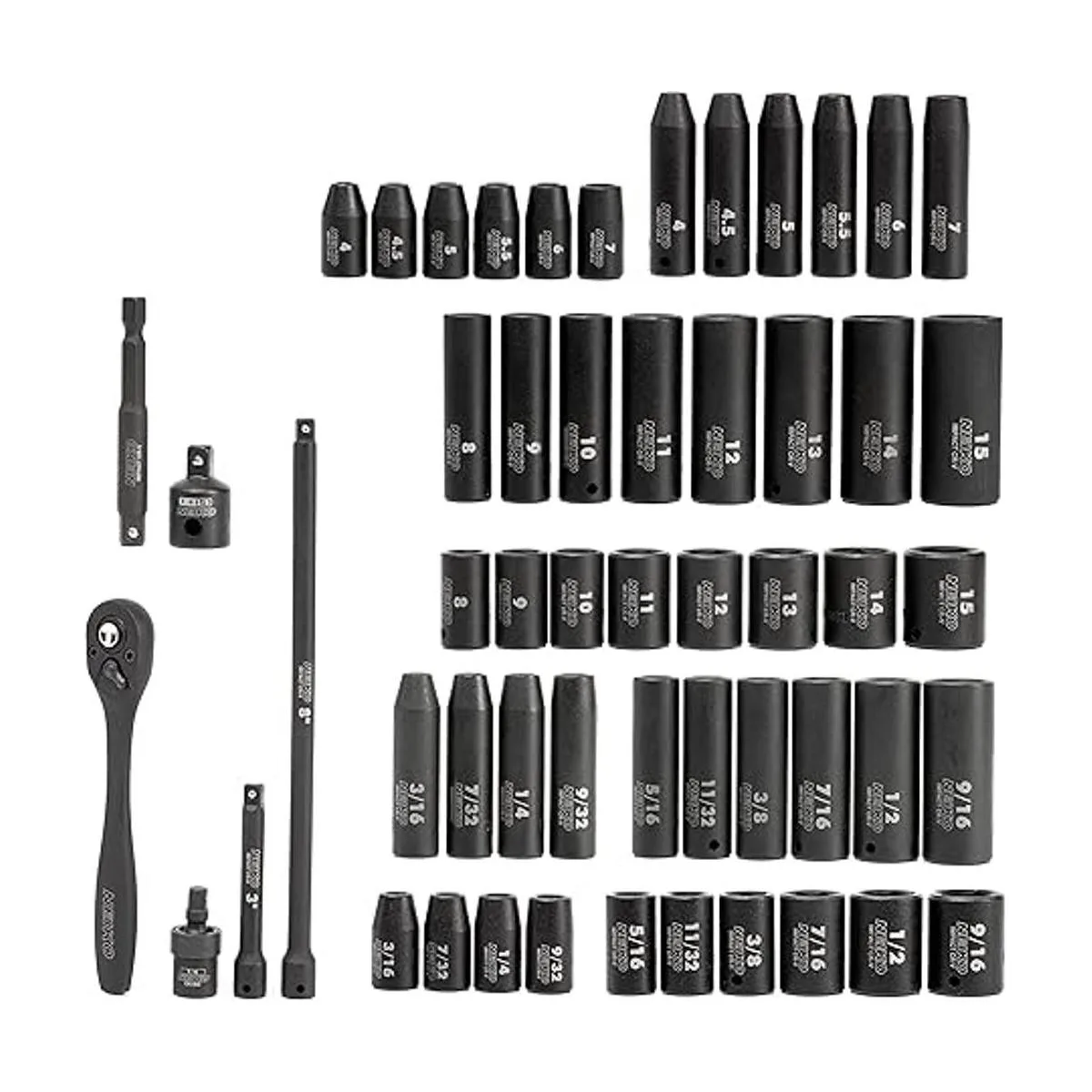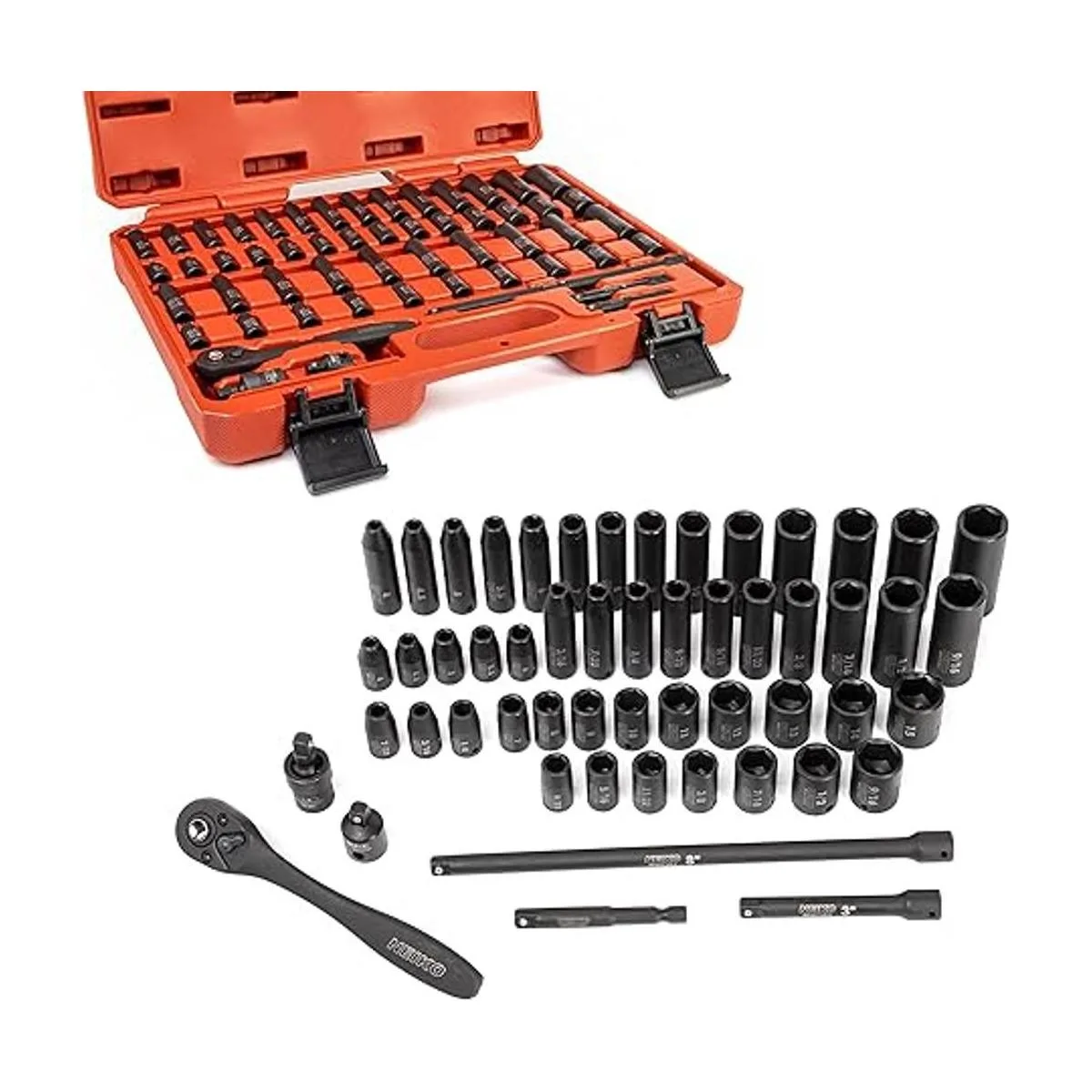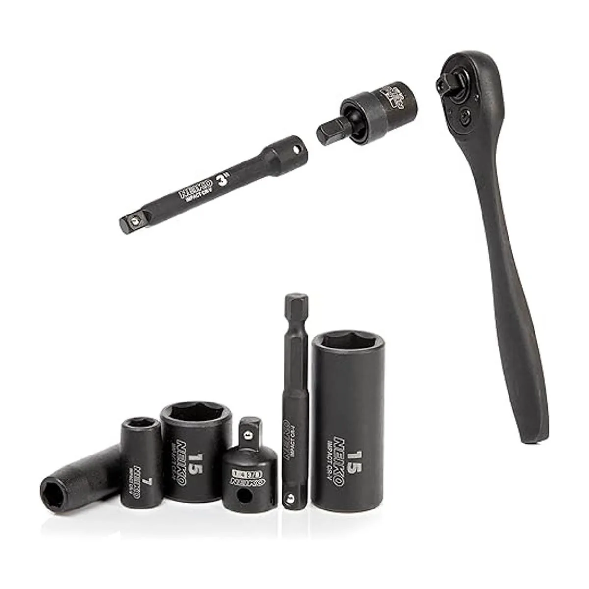 NEIKO 02437A Juego de llaves de impacto de 14 pulgadas 54 piezas MM y SAE 316 pulgadas 916 pulgadas y 4 15 Profundidad y poco profunda Acero CrV trinquete 14, reductor, extensiones, junta universal y adaptador de vástago hexagonal