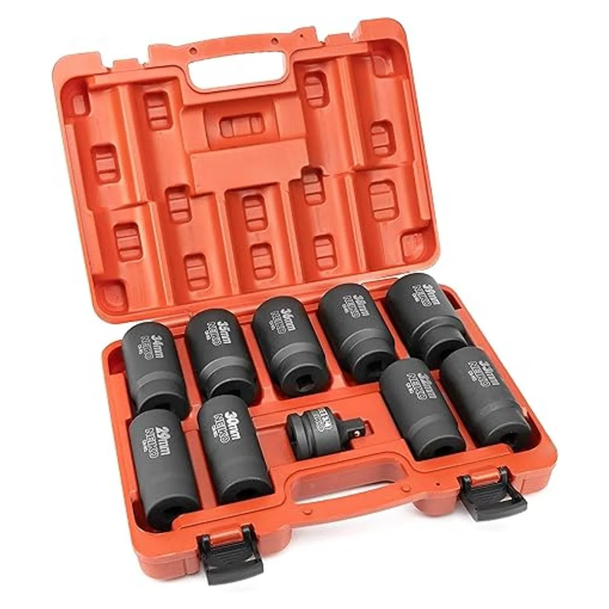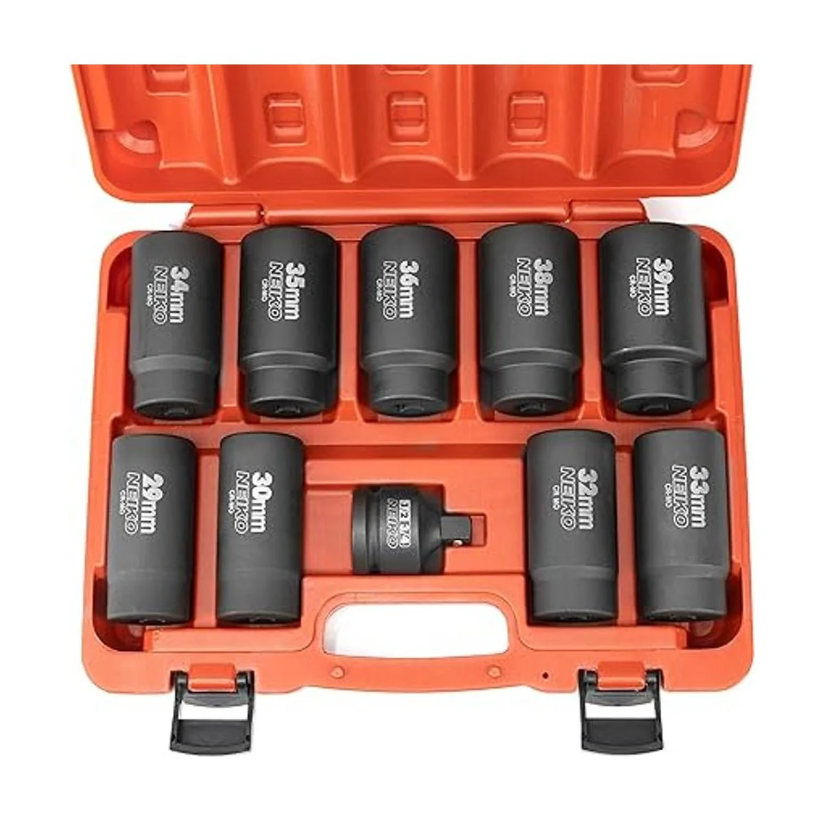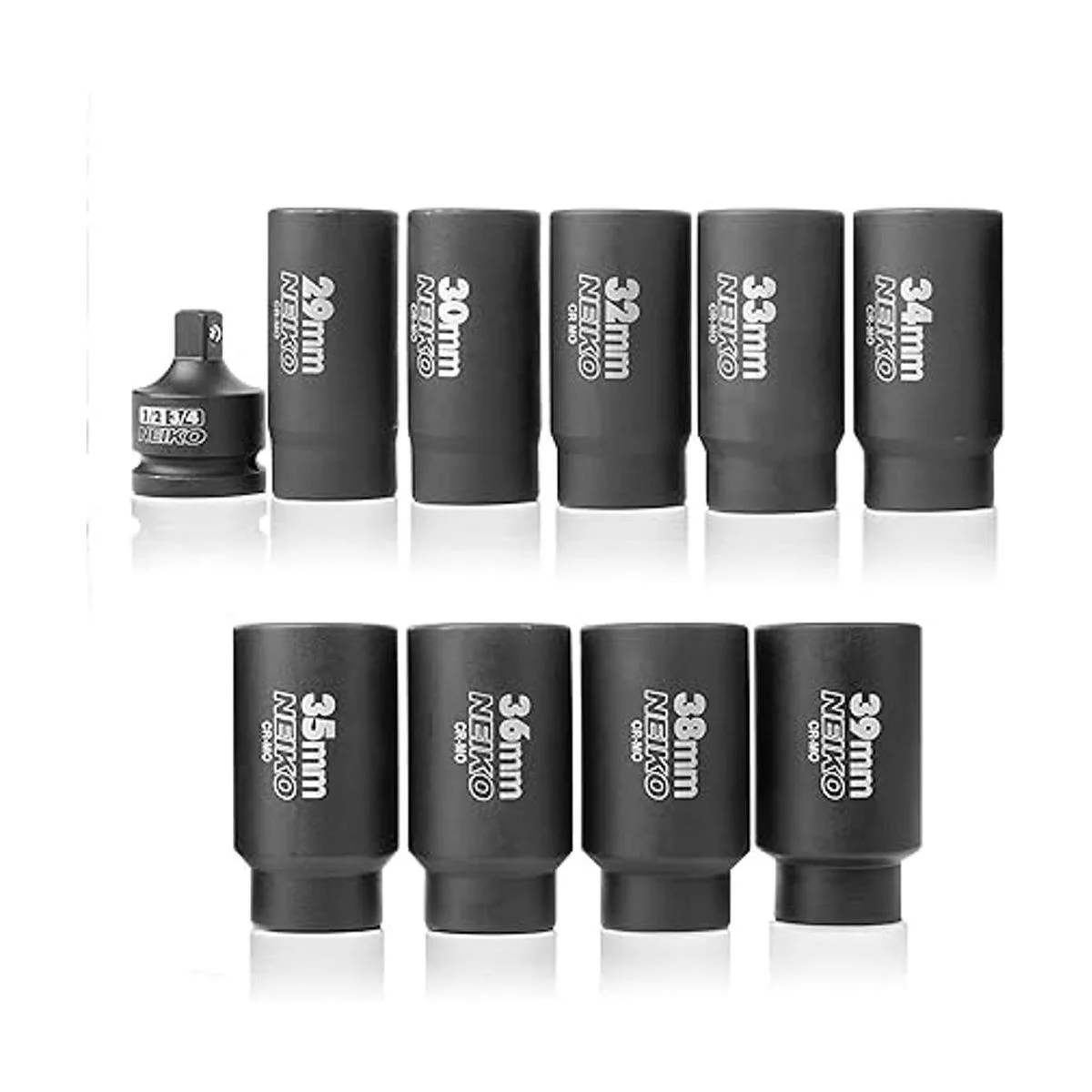 NEIKO 02531A Juego de llaves de impacto profundo de 12 pulgada Juego de llaves de eje y husillo 10 piezas 12 puntos métrico de 1.142 in 1.535 in CrMo Adaptador de impacto Reductor de 34 pulgadas a 12 pulgadas
