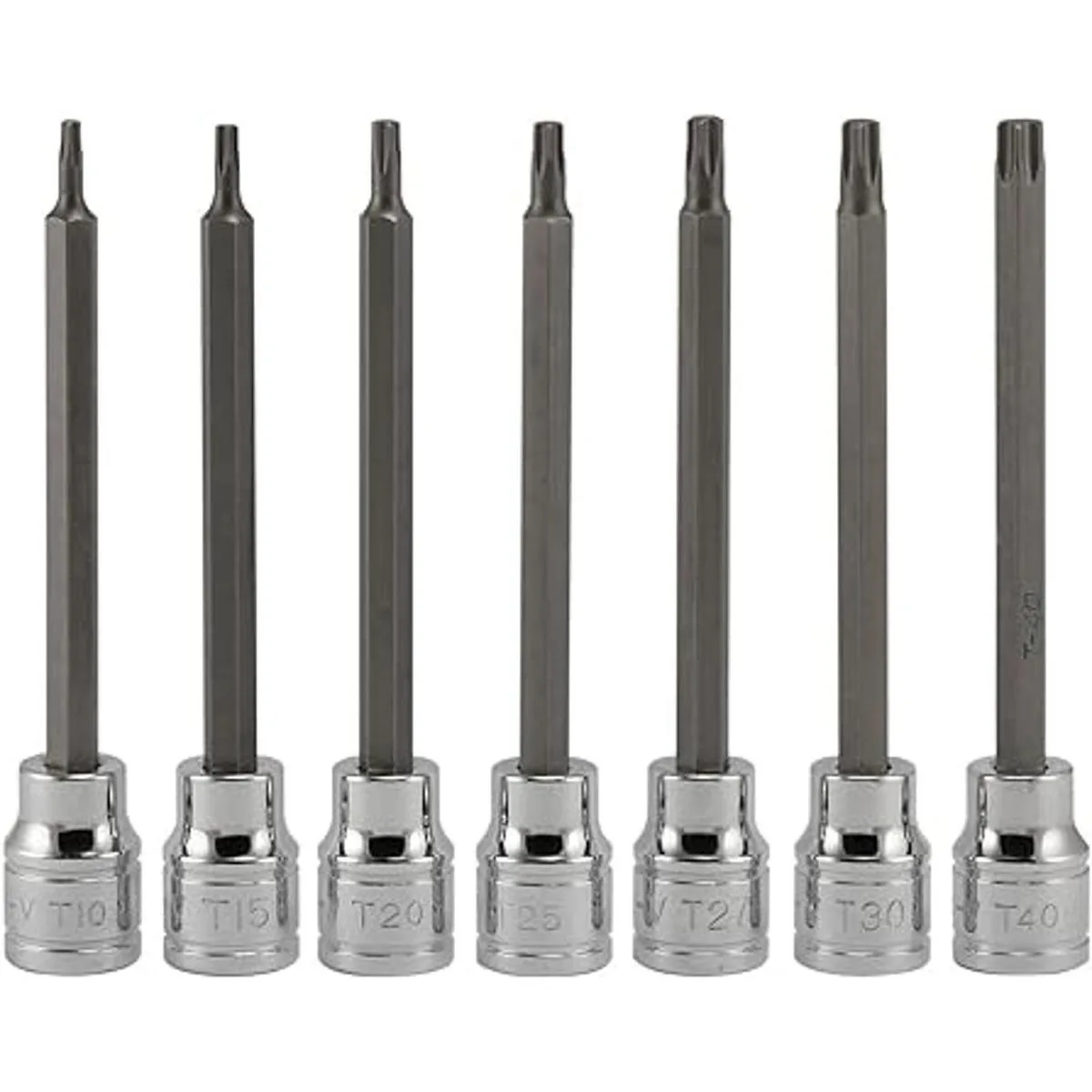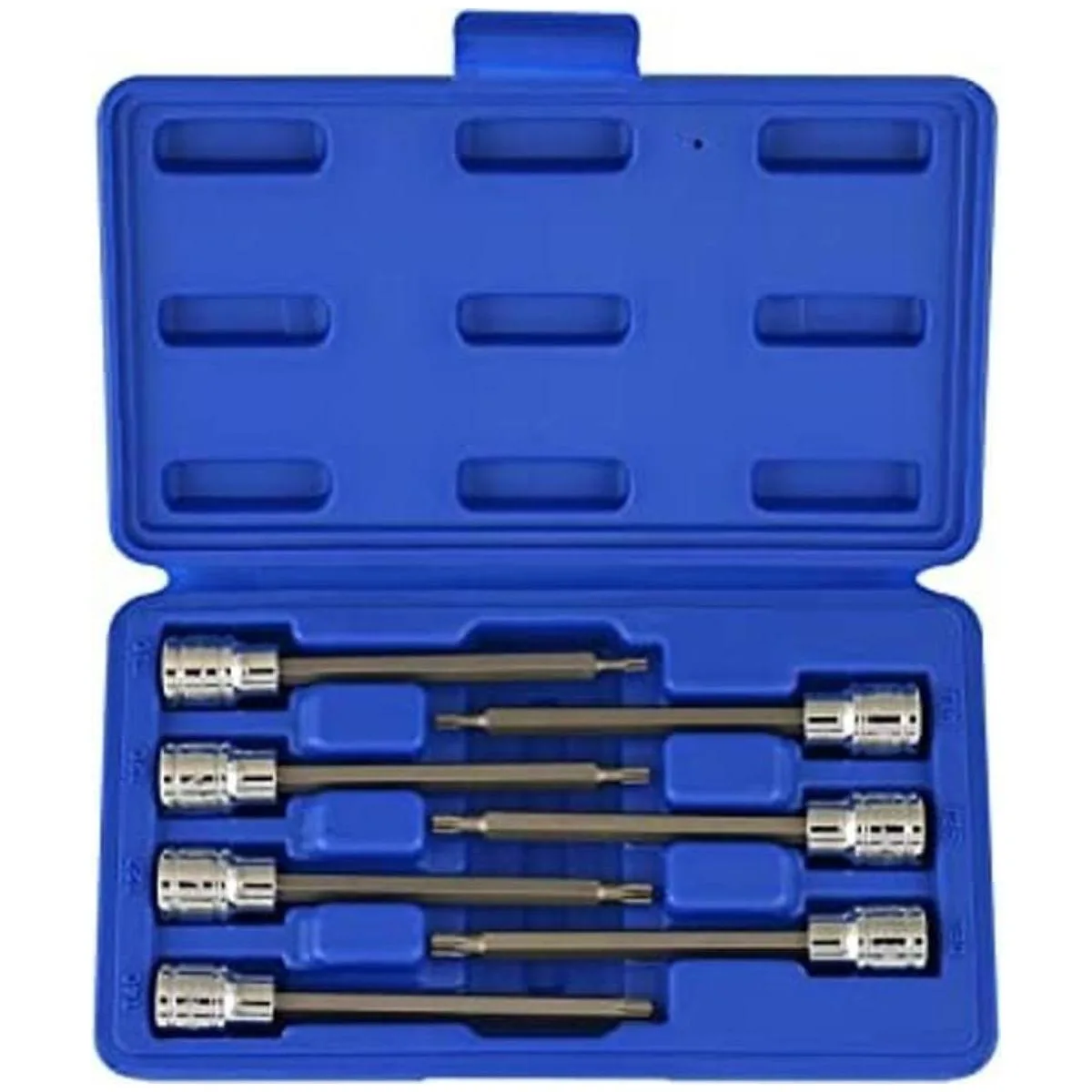 Incluye: 3/8 pulgadas Torx Star Bit Tamaños de enchufe T10, T15, T20, T25, T27, T30 y T40.