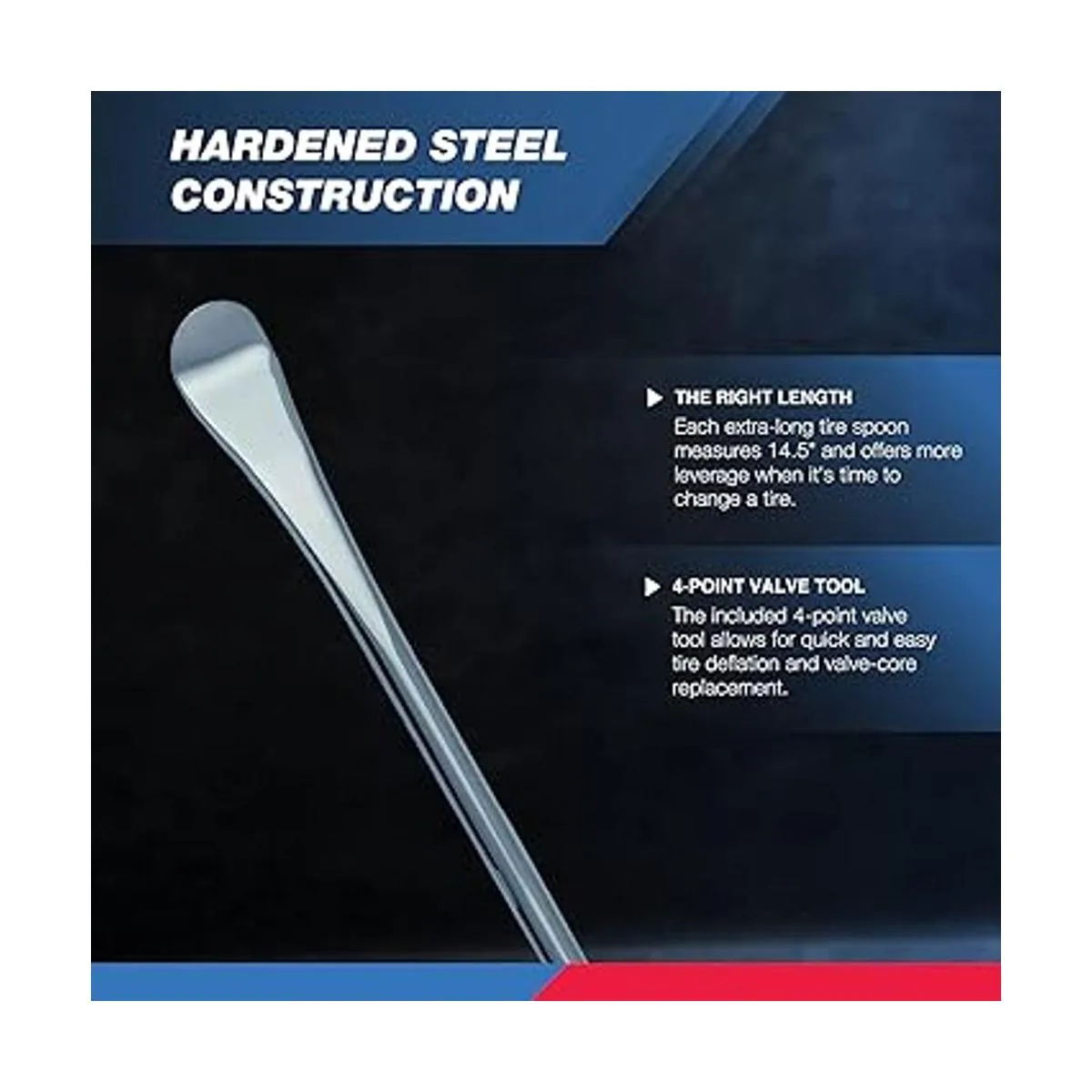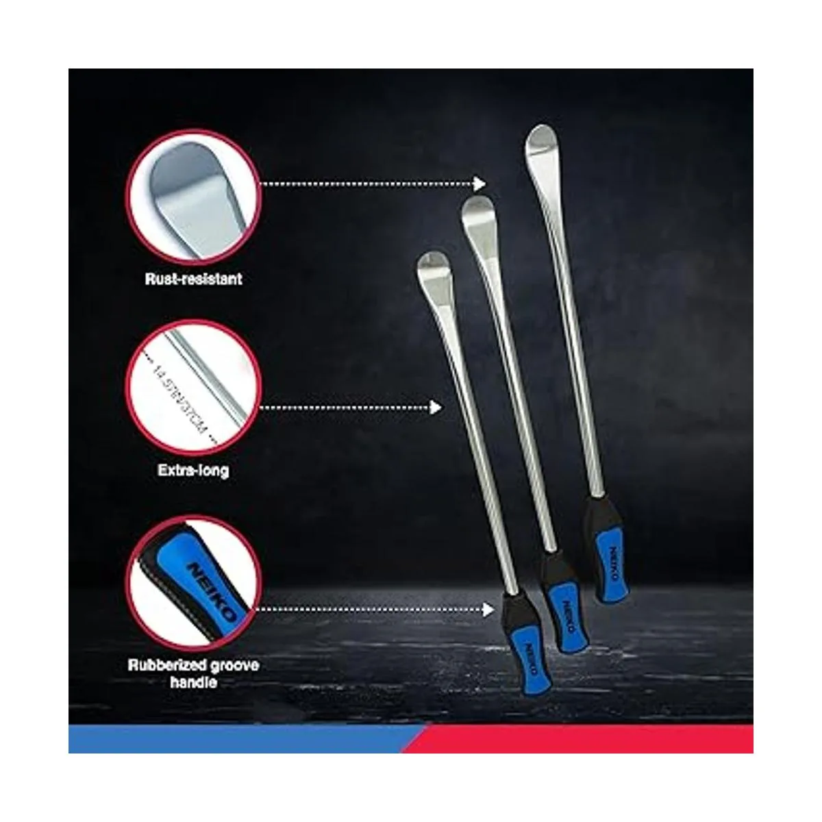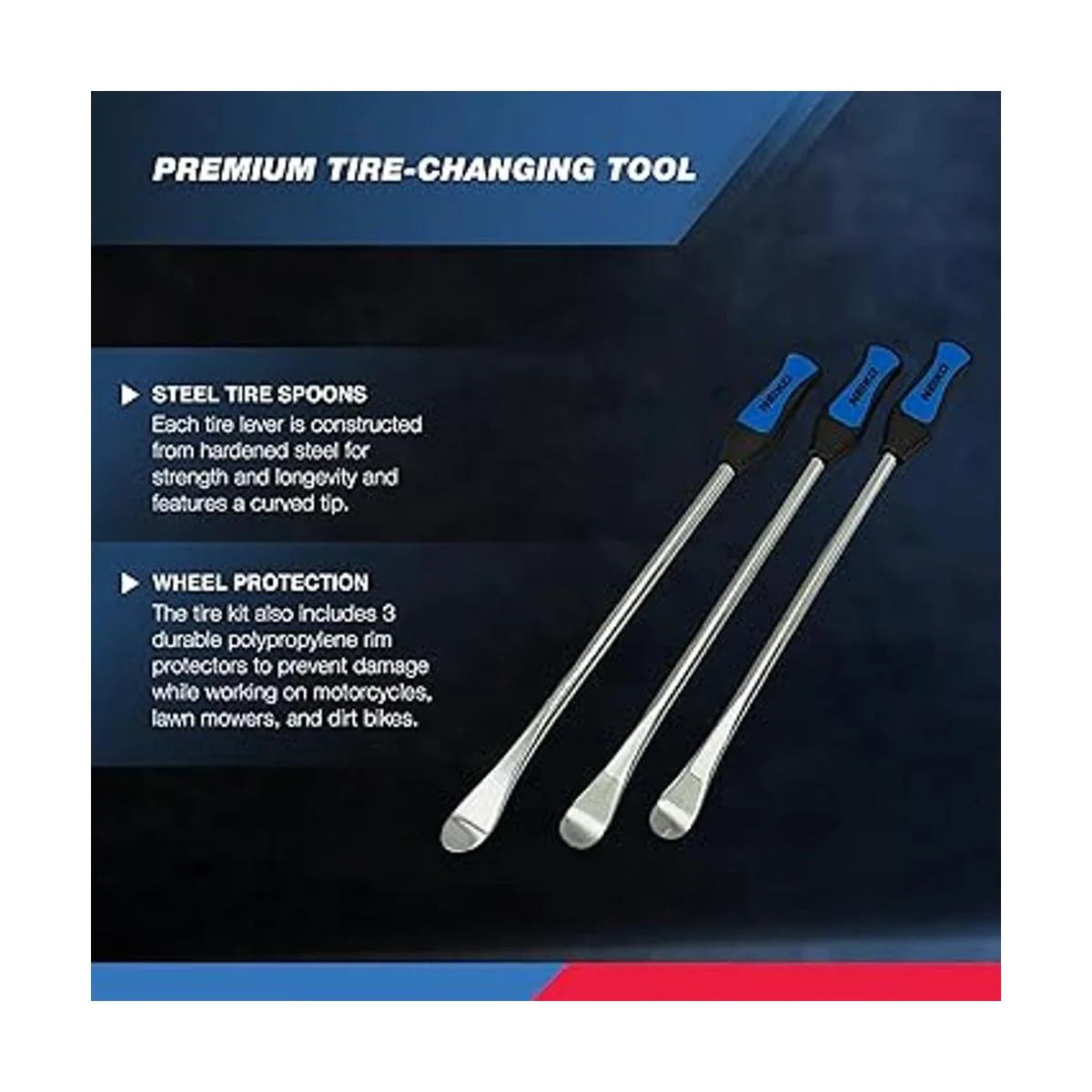 NEIKO 20601A Kit de herramientas de hierro para cuchara de neumáticos de acero de 14.5 pulgadas Herramienta profesional de cambio de neumáticos para motocicleta, moto de cross, cortacésped 3 cucharas de neumáticos, 3 protectores de llantas, herramienta de válvula, 6 núcleos de válvula