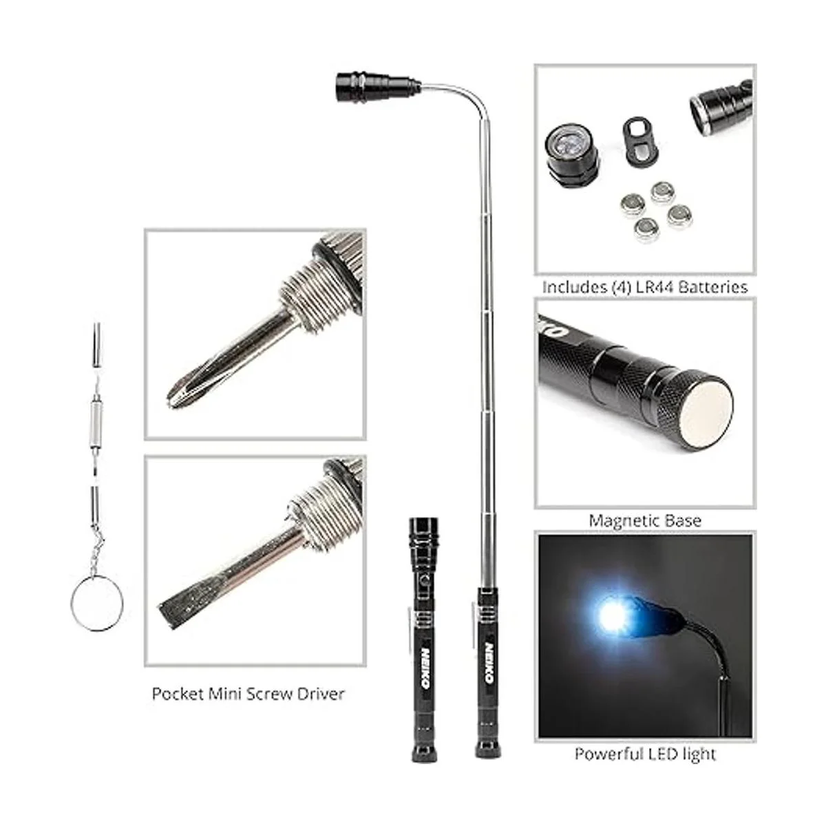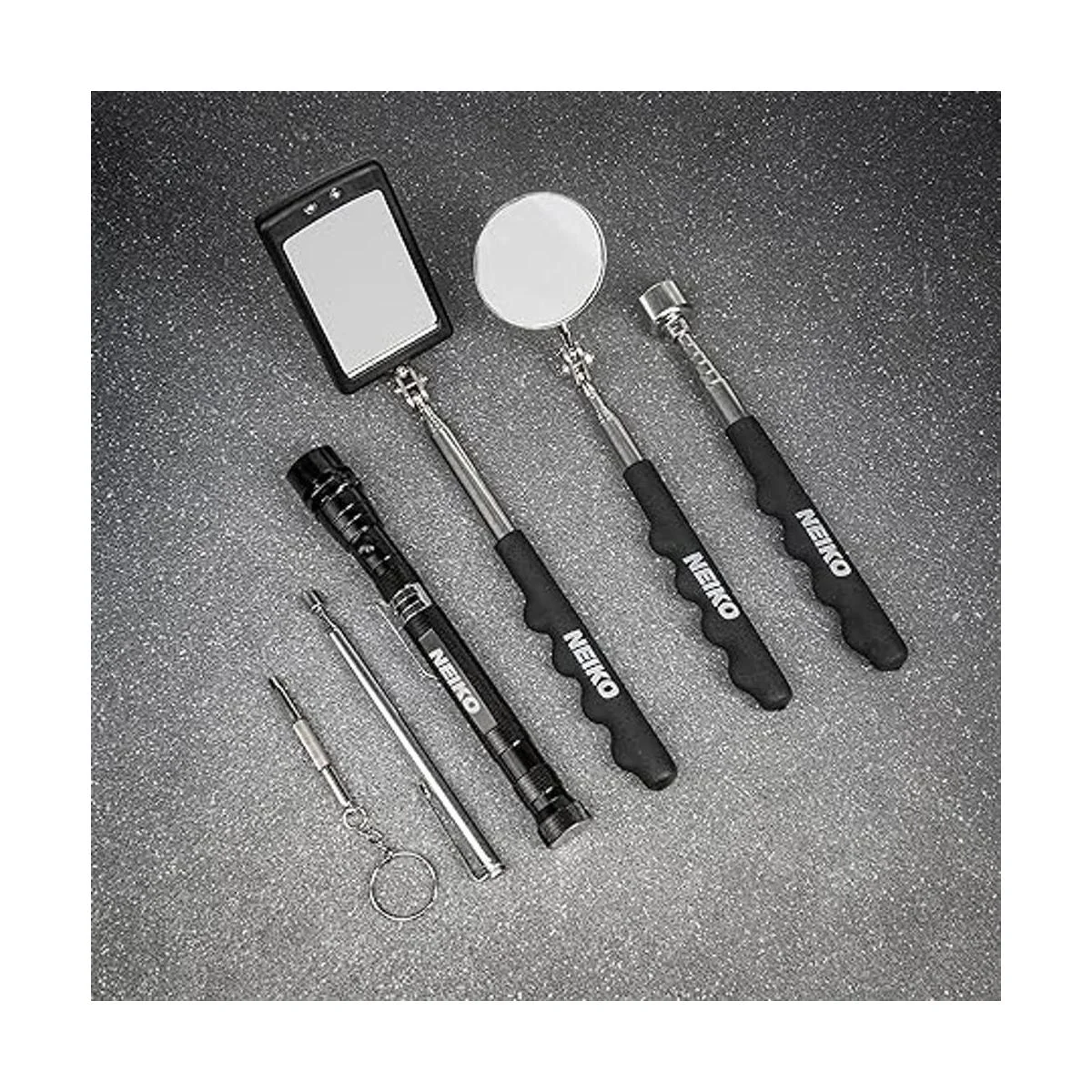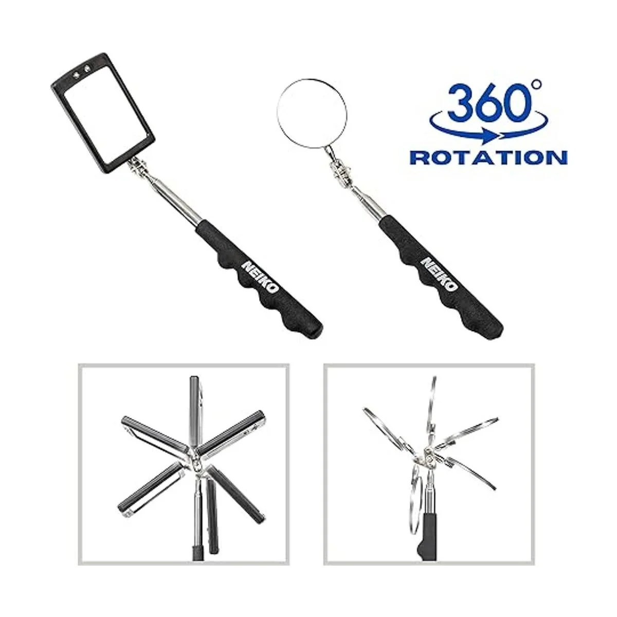 NEIKO 20736A 6 Juego de herramientas magnéticas y espejo telescópico, herramienta de recolección magnética telescópica ajustable, herramienta de recuperación de linterna de 15 libras, giro de 360, espejo magnético, herramientas magnéticas para mecánicos