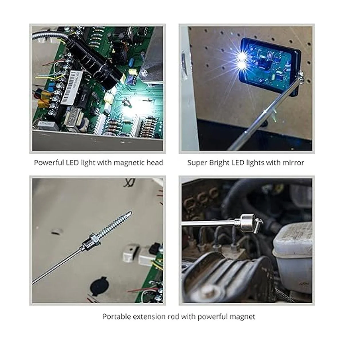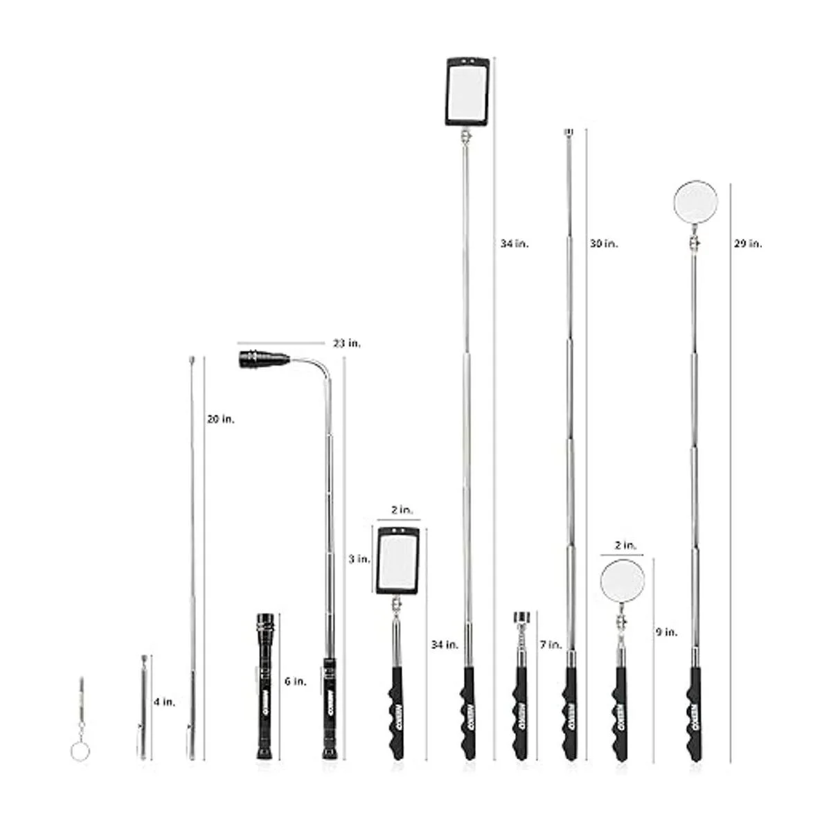 Incluye: espejo de inspección cuadrado con luz LED, espejo telescópico redondo, linterna LED, 15 libras. Varilla magnética, 1 libra. Varilla magnética y destornillador 3 en 1.