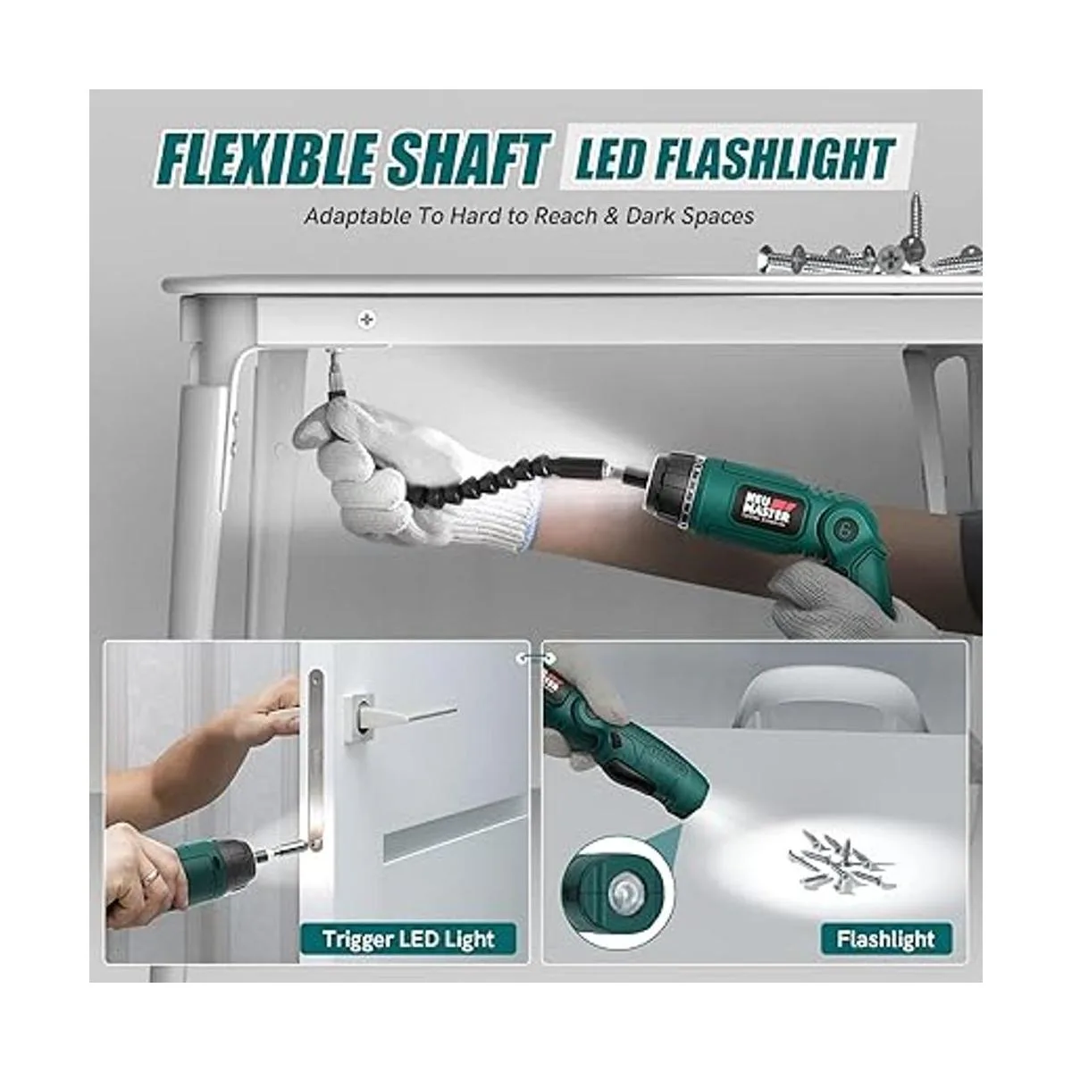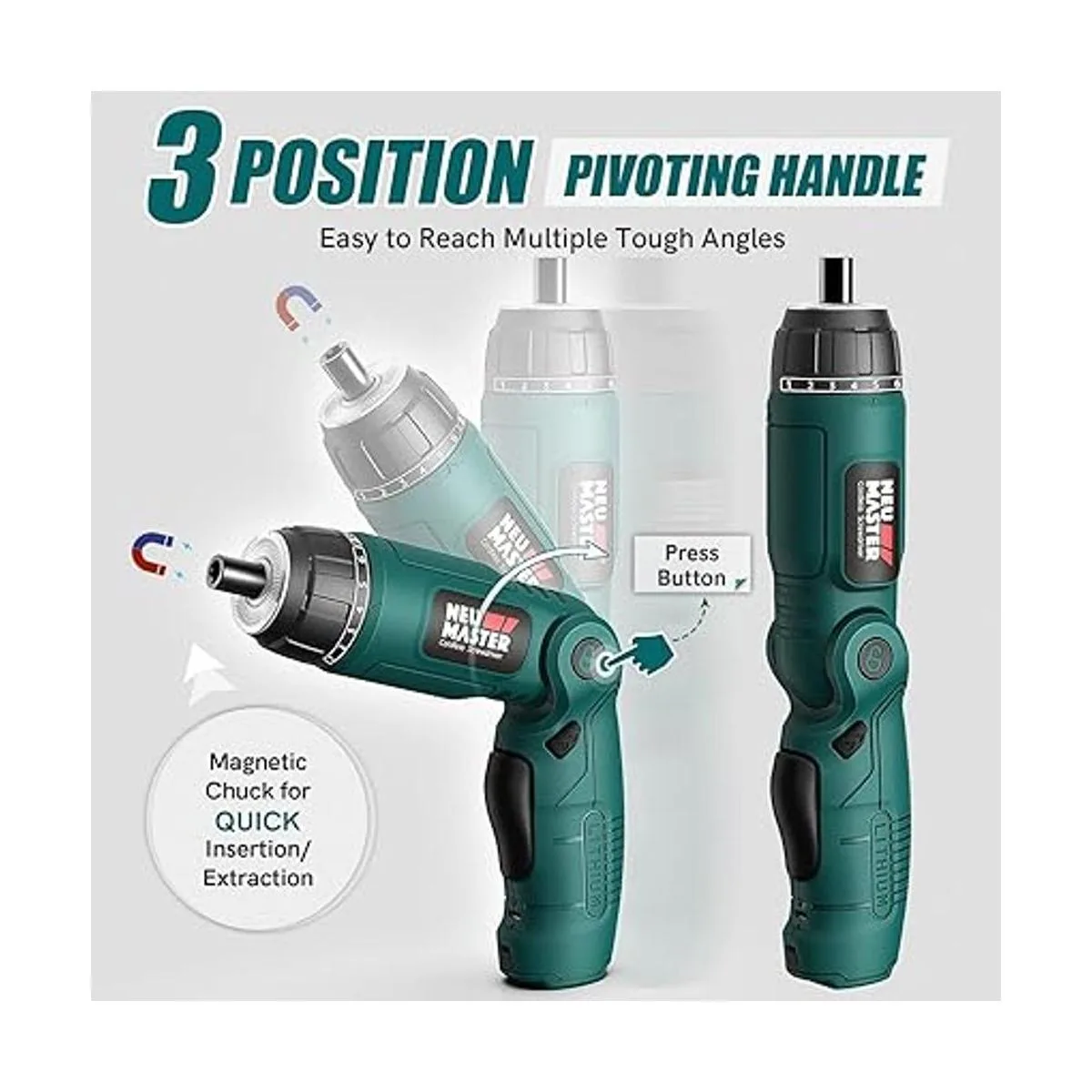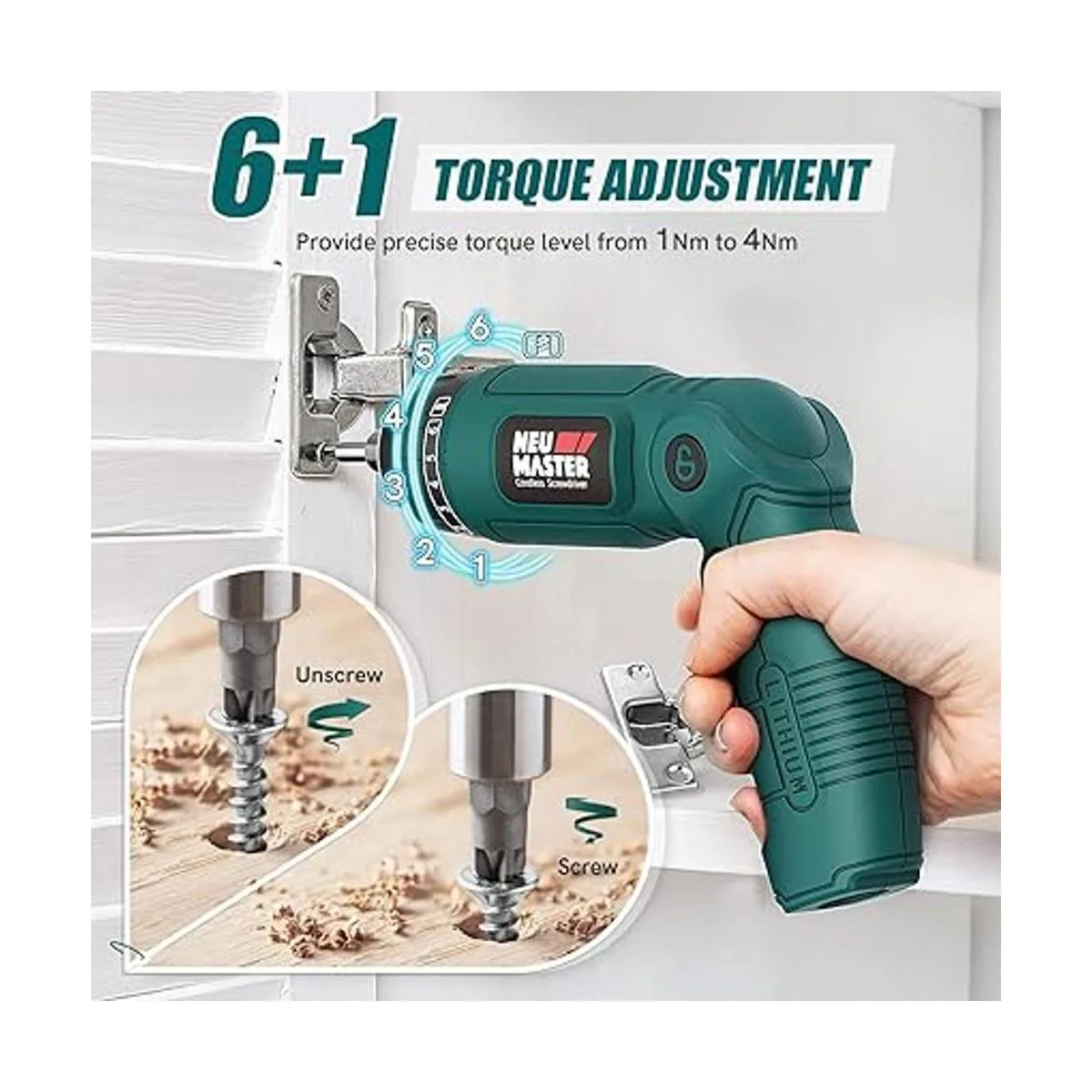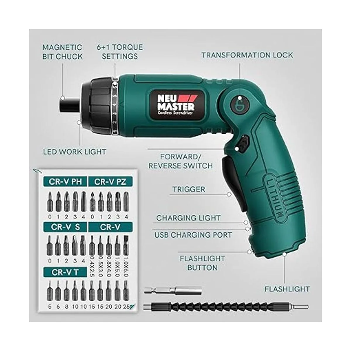 NEU MASTER Destornillador inalámbrico, destornillador eléctrico de 4 V recargable con mango giratorio, ajuste de par 61, linterna LED frontal y trasera, cable USB, accesorios de 32 piezas