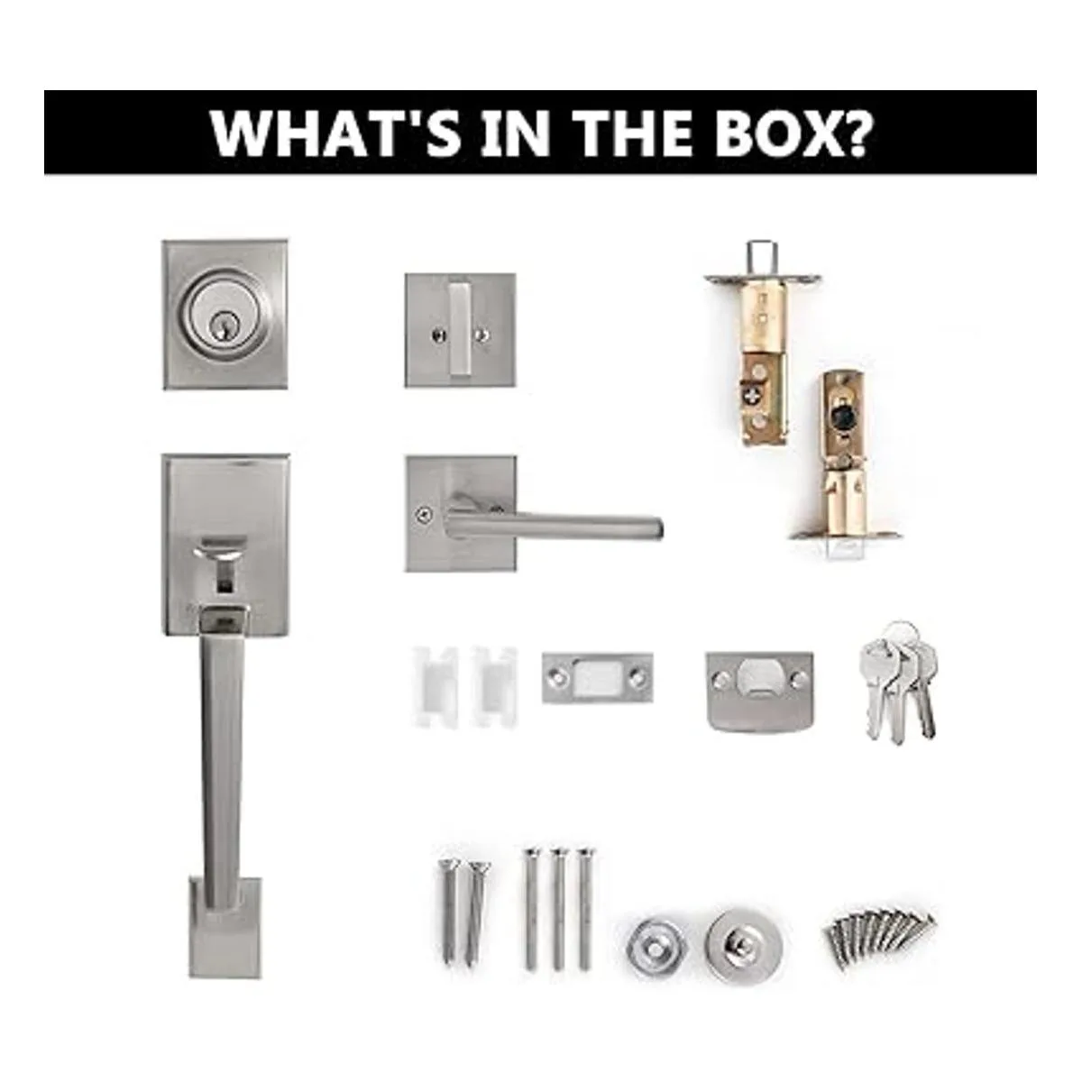 Contenido de la caja: 1 juego de manija y palanca, 1 juego de cerrojo, 2 pestillos, 2 placas de golpe, 2 cajas de golpe, llaves, kit de tornillos, instrucciones de instalación.
