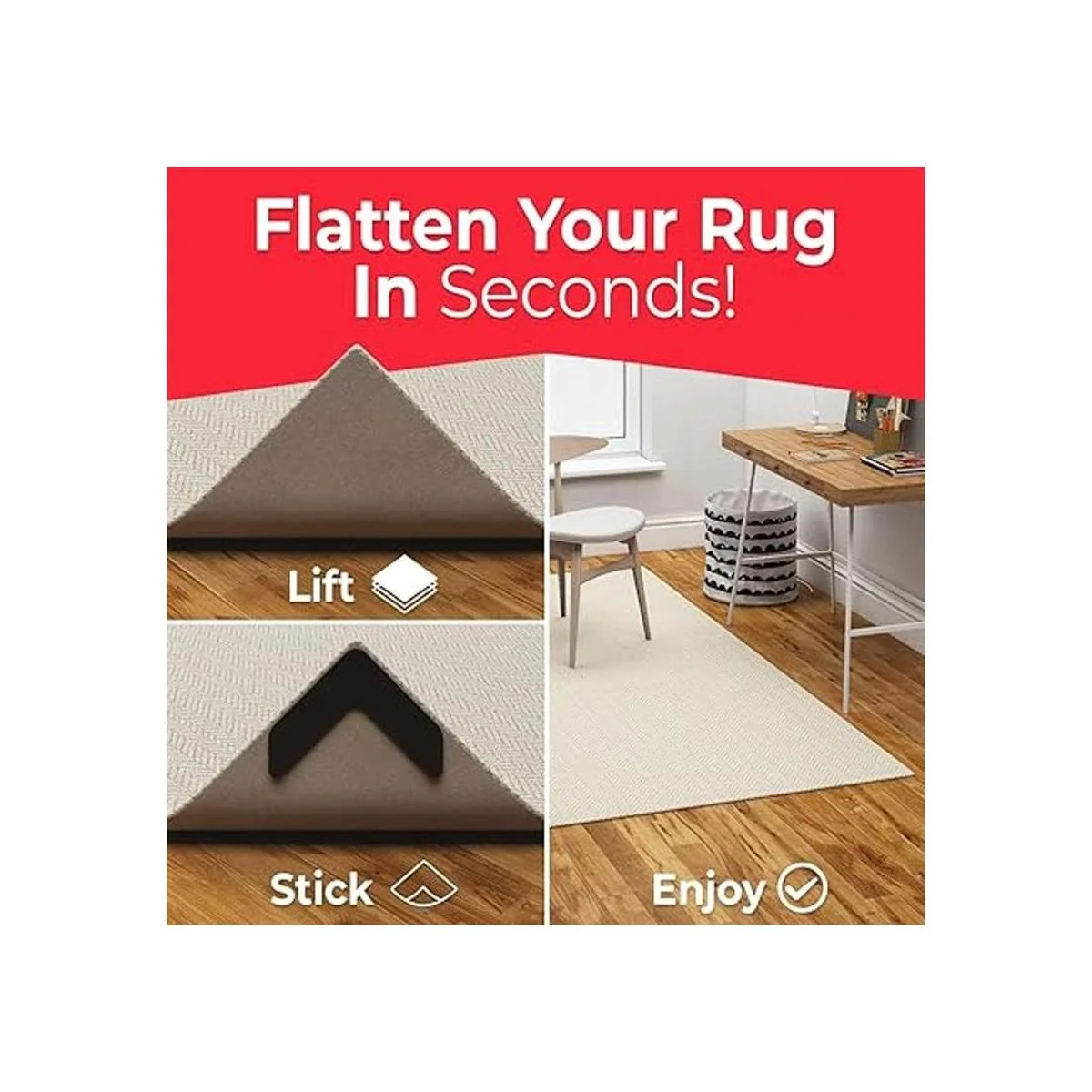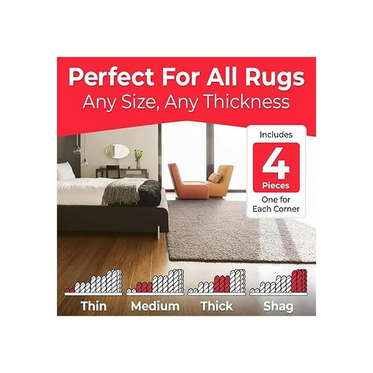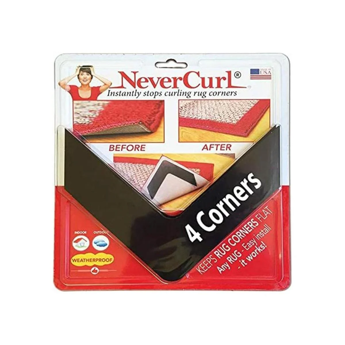 NeverCurl Adhesivo para aflombras que evita que se enrollen las esquinas. Apto para suelos de madera. Para alfombres en interiores y exteriores. Incluye 4 unidades. No es una almohadilla antiderrapante. Fabricada en EE. UU., Plástico, Negro