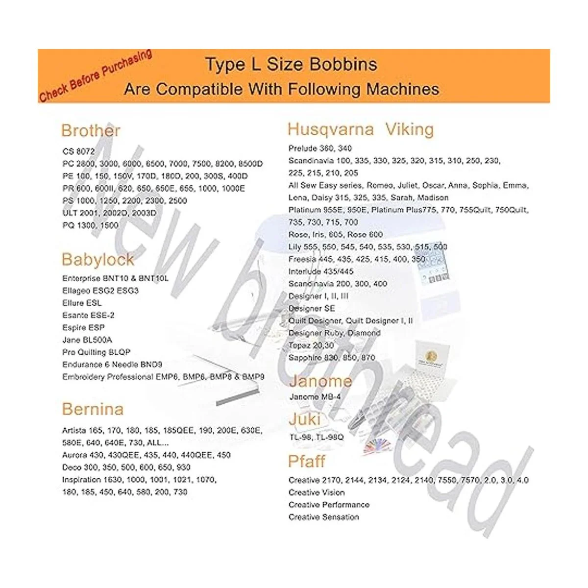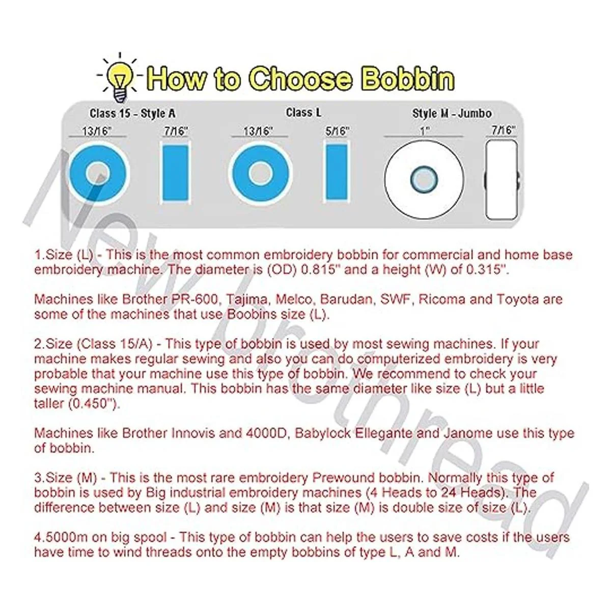 Los hilos de bobina preenrollados tipo L SA155 se adaptan a máquinas de bordado o coser comerciales y domésticas, comprueba el manual de tu máquina antes de comprar. Hemos marcado las dimensiones de la bobina tipo L en la quinta imagen. Enumeramos muchas marcas típicas y tipos de máquinas de bordado y coser que son compatibles con hilos de bobina preenrollados de tamaño L tanto en la sexta imagen como en la descripción del producto para tu referencia.