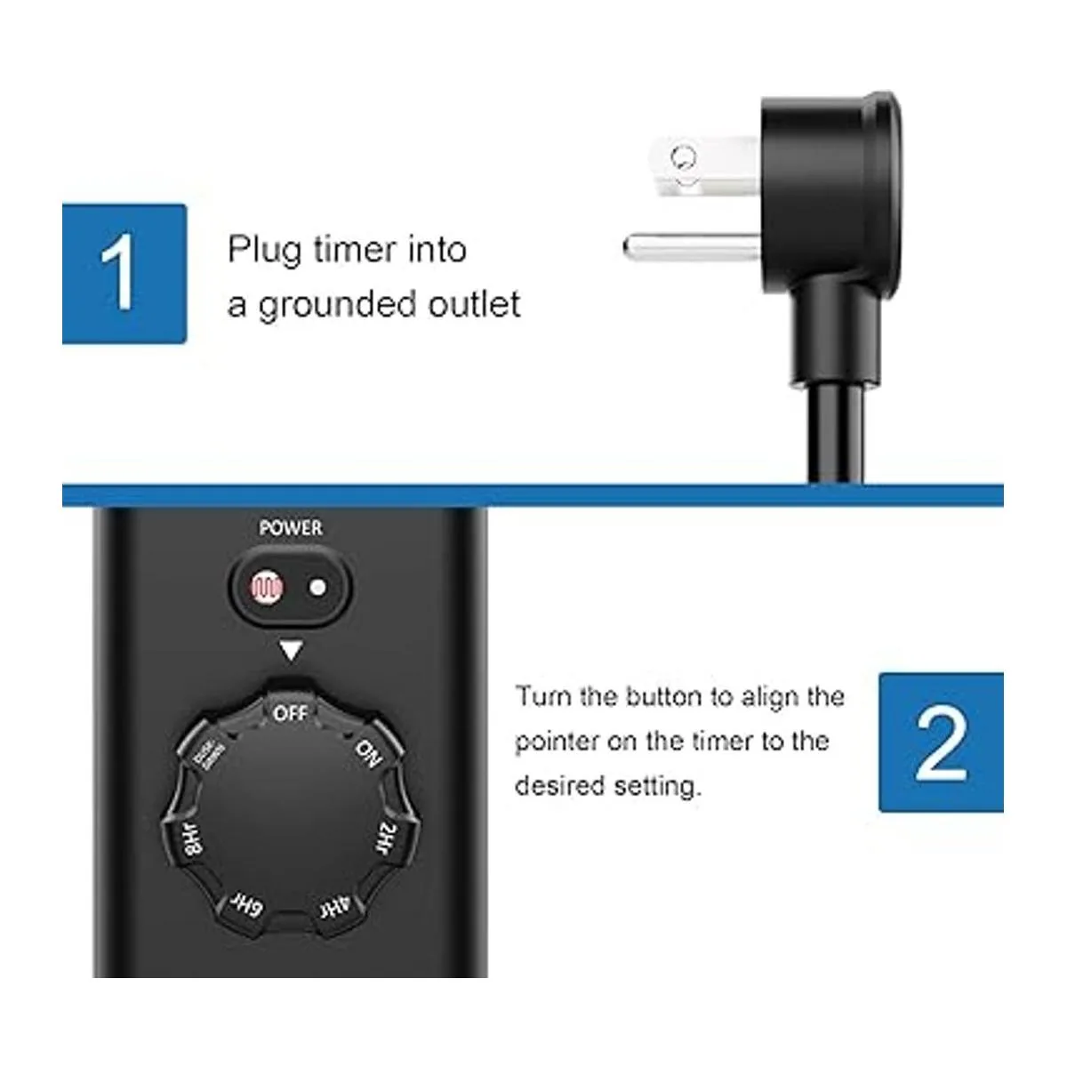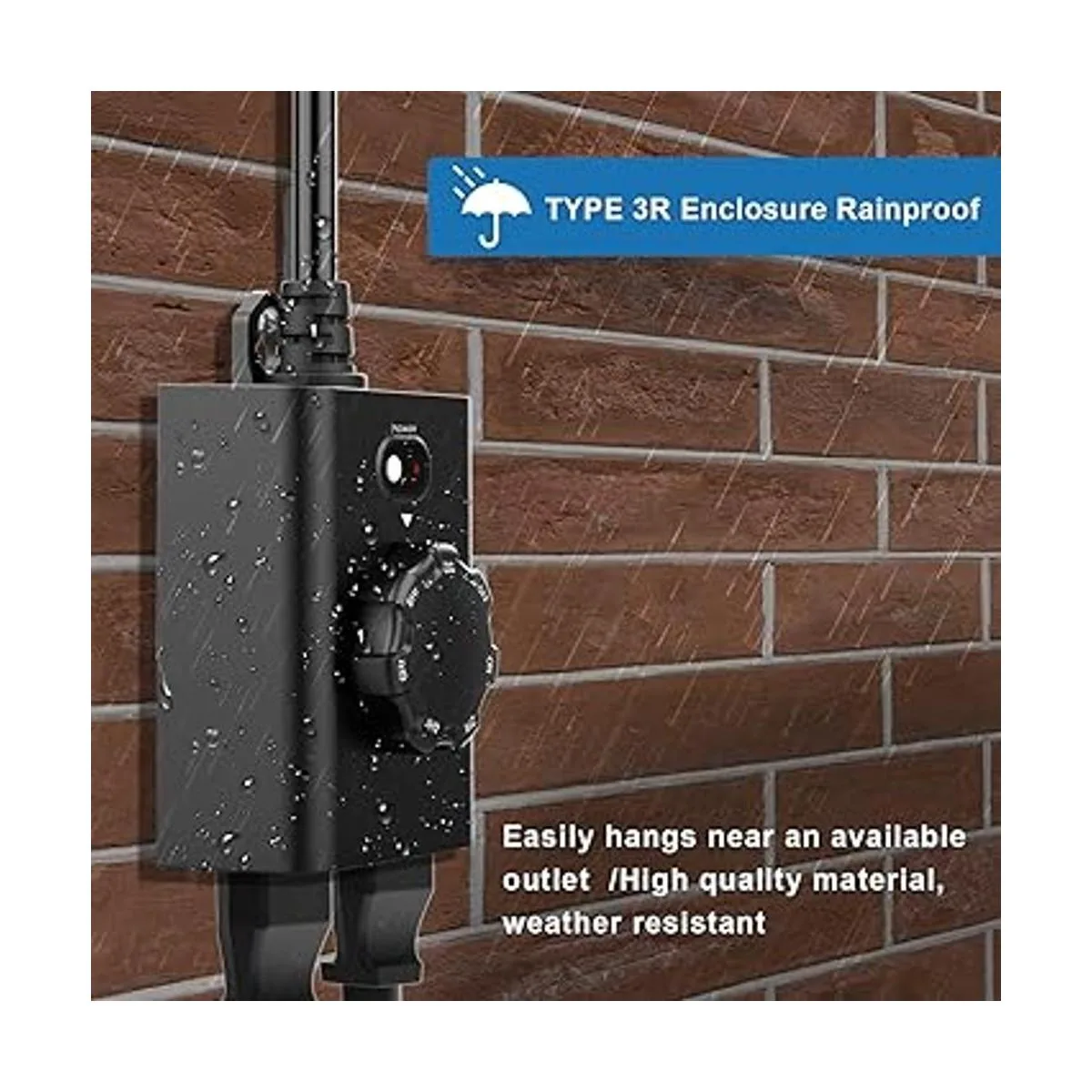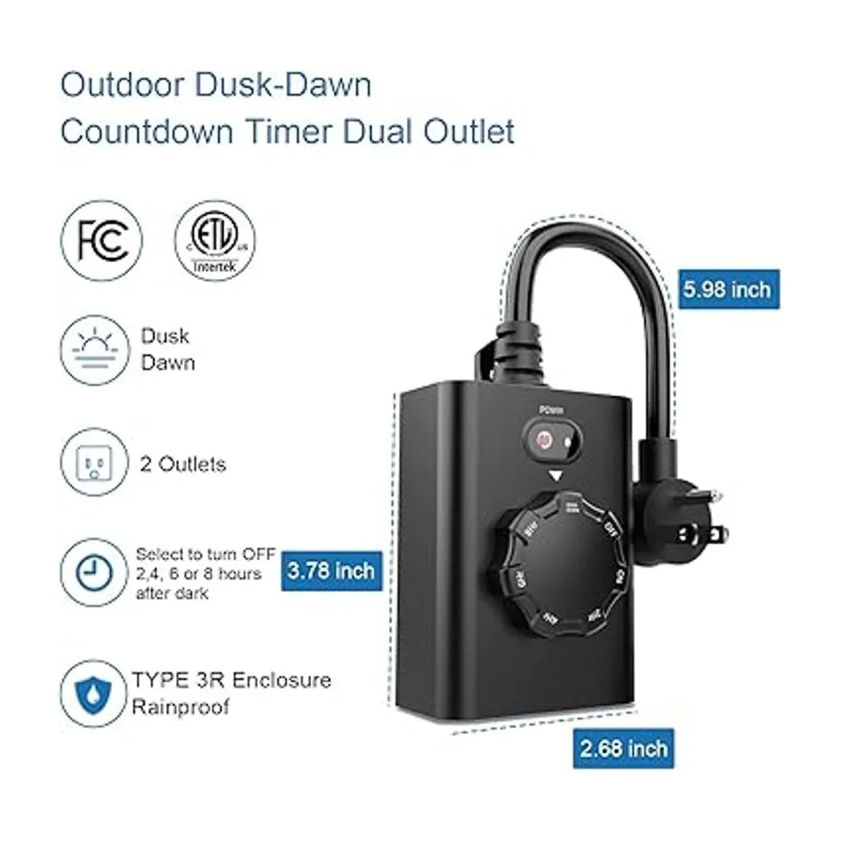 Fácil de usar e instalar: las salidas de temporizador para exteriores tienen 3 modos, elige el modo que quieras: 1. Modo de encendido/apagado, 2. Encendido al anochecer, apagado al amanecer, 3. Encendido al anochecer, apagado después de 2, 4, 6, 8 horas, simplemente conecta tus luces, enciende el dial y deja que nuestro temporizador funcione para ti.