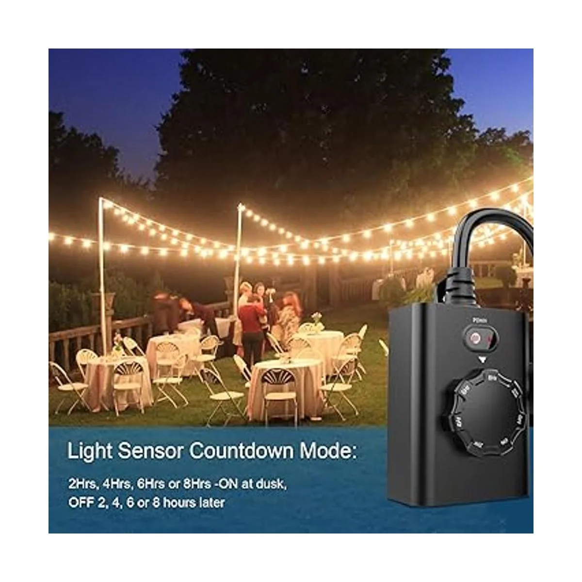 New One Enchufe de temporizador con sensor de luz para exteriores, impermeable, temporizador del atardecer al amanecer, 2 tomas de tierra, interruptor de enchufe resistente a la intemperie para decoraciones navideñas, luces de Navidad e iluminación al aire libre, certificado ETL FCC