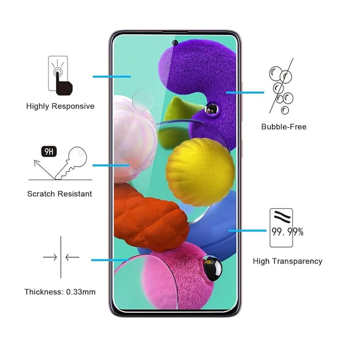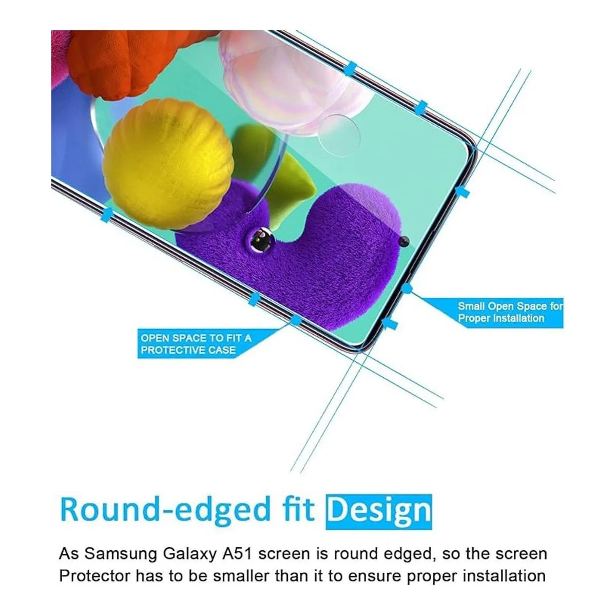 El protector de pantalla proporciona la máxima protección para la pantalla táctil Samsung Galaxy A51. El espacio entre Samsung Galaxy A51 y el protector de pantalla permite el espacio adecuado para la instalación de la mayoría de las fundas de teléfono.