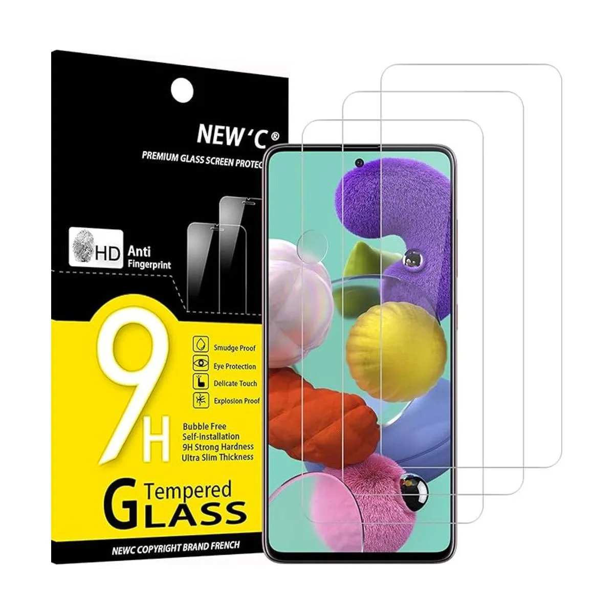 NEWC Paquete de 3 protectores de pantalla de vidrio templado para Samsung Galaxy A51, antiarañazos, antihuellas, sin burbujas, dureza 9H, 0.013 in ultra transparente, vidrio templado ultra resistente