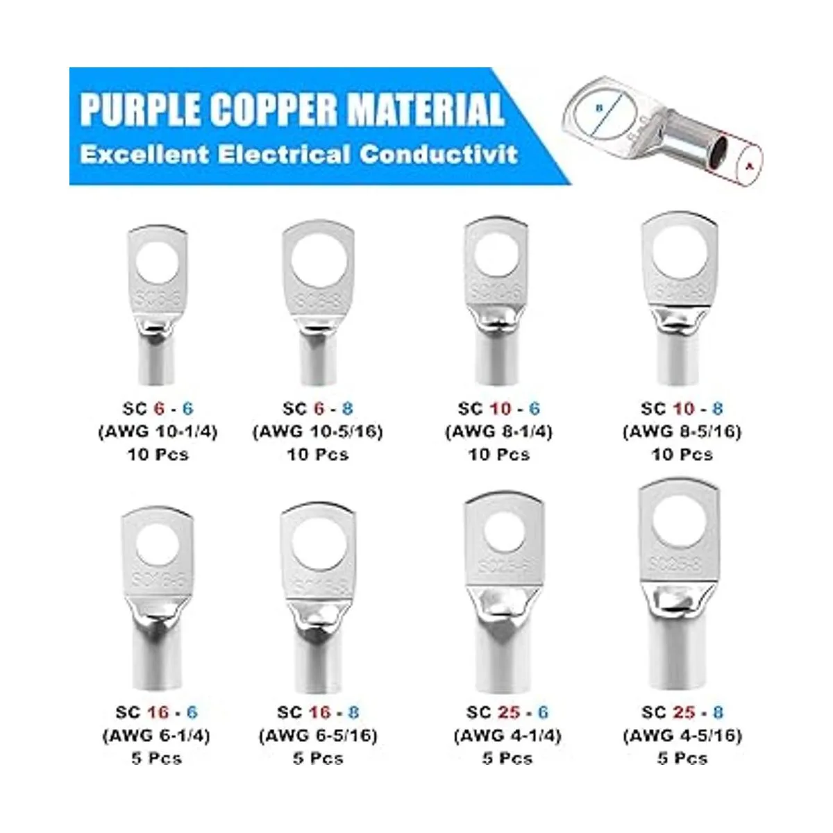 Kit de terminales de varios tamaños: 60 terminales de anillo de cobre con caja. Disponible en 8 tamaños para adaptarse a la mayoría de aplicaciones.