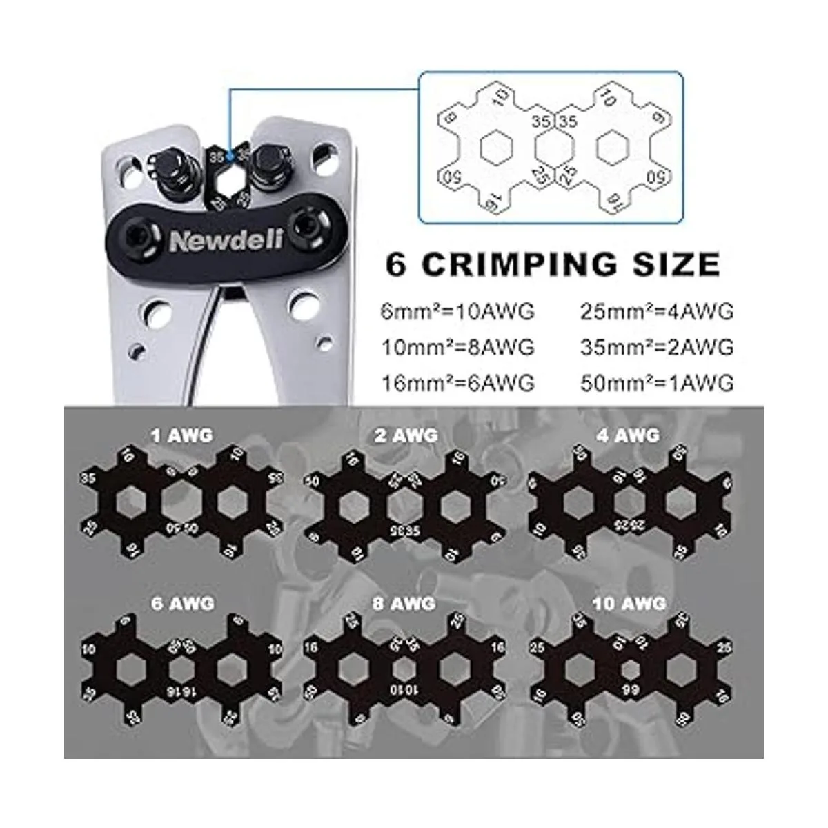Cabezal giratorio de crimpado: la herramienta está disponible en 6 tamaños de crimpado, 10, 8, 6, 4, 2, 1 AWG 6 mm/10 mm16 mm/25 mm/35 mm/50 mm, y utiliza un cabezal giratorio con un pasador de bloqueo cargado por resorte para retener la cabeza.