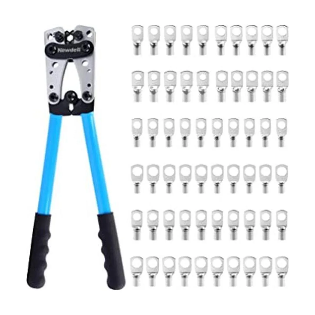 Newdeli Herramienta de engarzado de cable de batería 1010 AWG con 60 terminales de anillo de cobre, juego de terminales de cable de 8 tamaños, crimpadora de alambre resistente para terminal de cable de batería