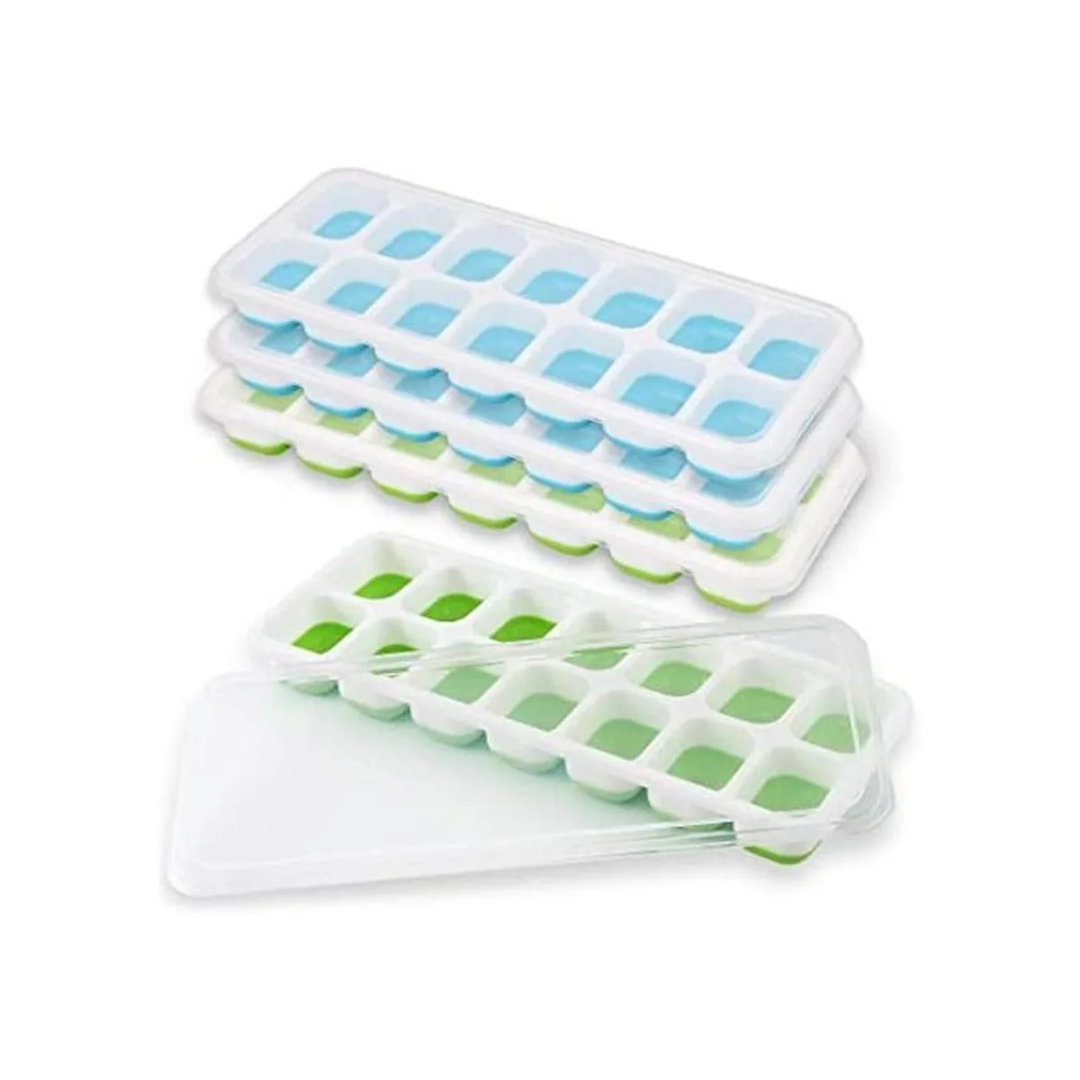 Tapa extraíble y apilable: las bandejas de hielo con tapa extraíble resistente a derrames que ayuda a mantener el olor del congelador fuera de los cubitos de hielo y ahorrar espacio.