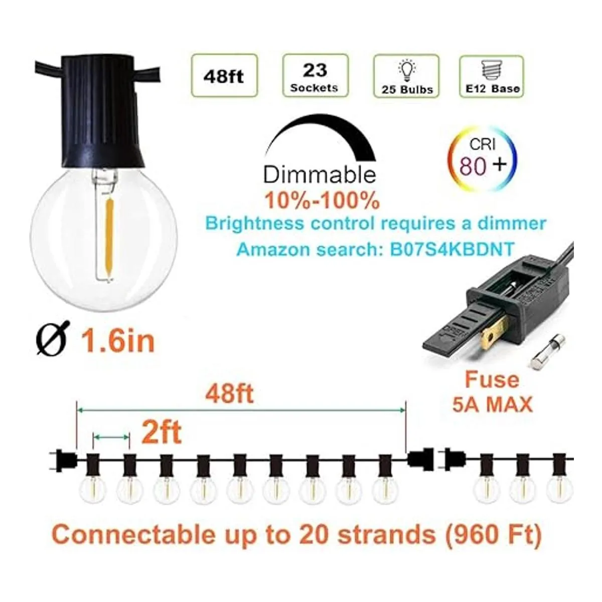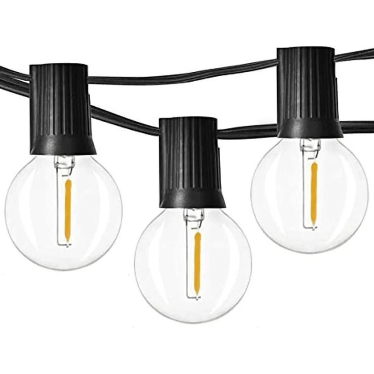 Newpow Tira de luces para exteriores de 48 pies con 232 piezas regulables, inastillables, impermeables, bombillas LED G40, plástico transparente, 1 W, 60 lúmenes, 2200 K, brillo cálido para decoración e iluminación en interiores y exteriores, color negro