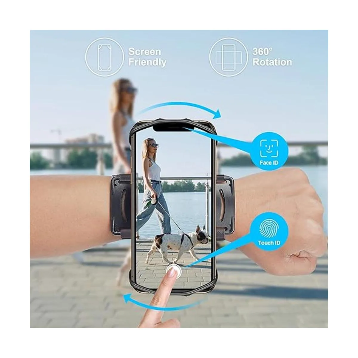 Garantía mejorada de 2 años Sin preguntas para o reemplazo. Soporte para Airpods o Airpods Pro Rotación de 360 grados Soporte oculto para llaves Gestión de cables de auriculares Ranuras de doble cierre Resistente al sudor y al agua Uso en antebrazo y pulsera Fácil pantalla táctil Correa transpirable perforada Diseño de agarre seguro