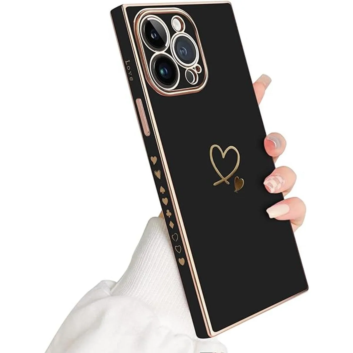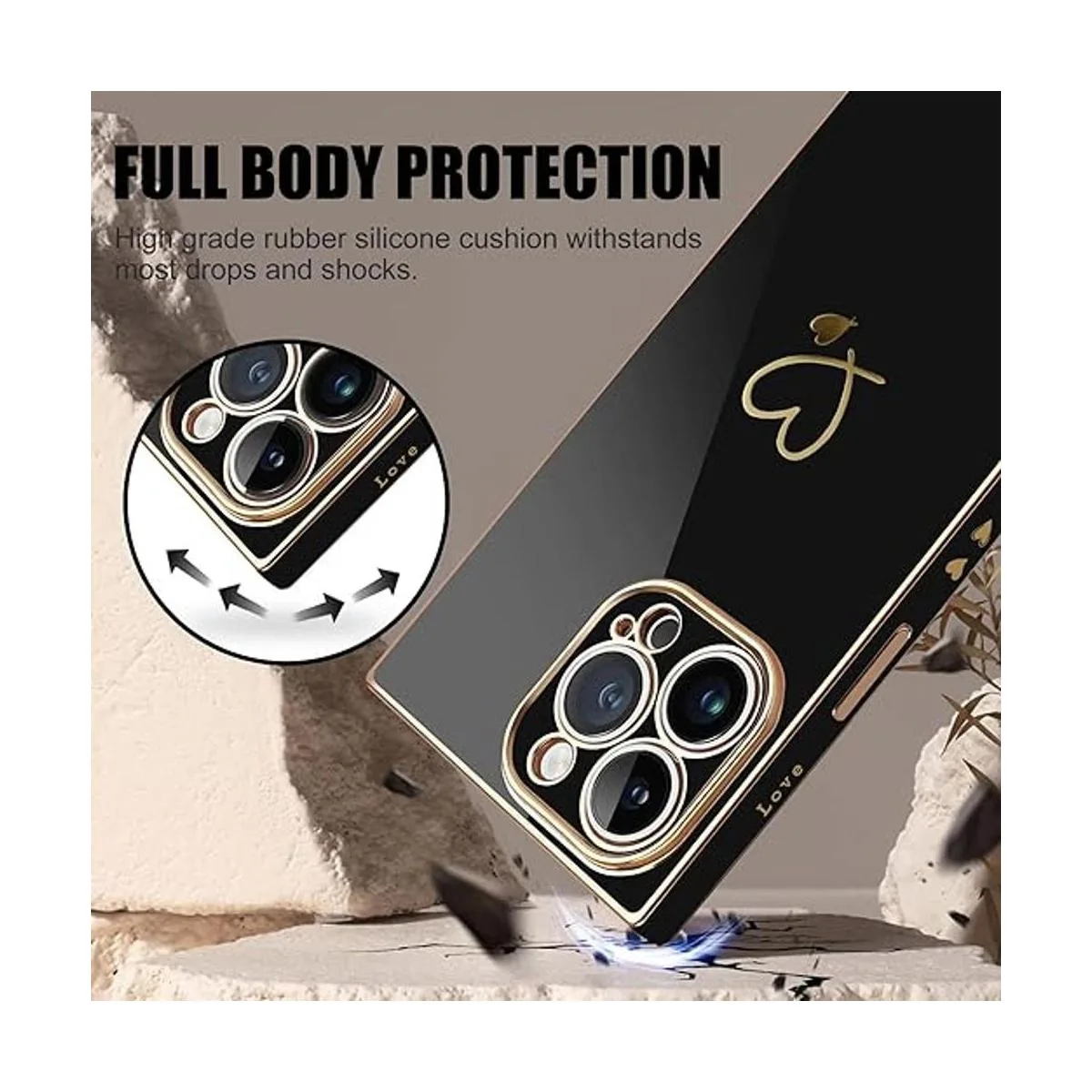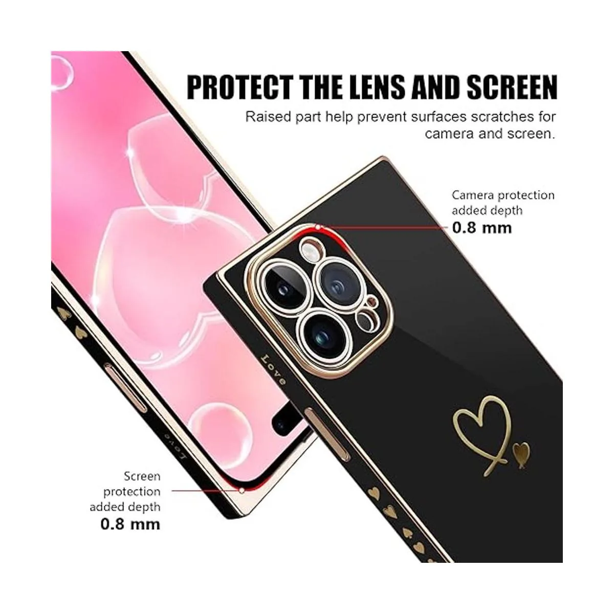Newseego Funda cuadrada para iPhone 14 Pro Max para mujeres y niñas, de lujo, chapado en negro, dorado, con patrón de corazón de amor, funda de protección completa de TPU suave para lente de cámara para iPhone 14 Pro Max con cadena linda, color negro