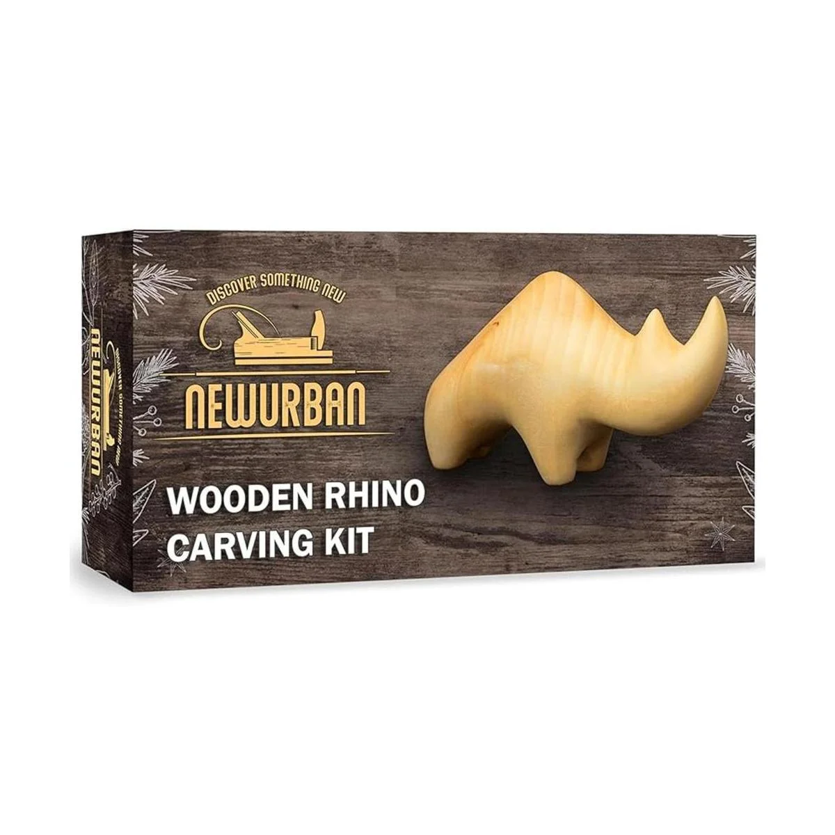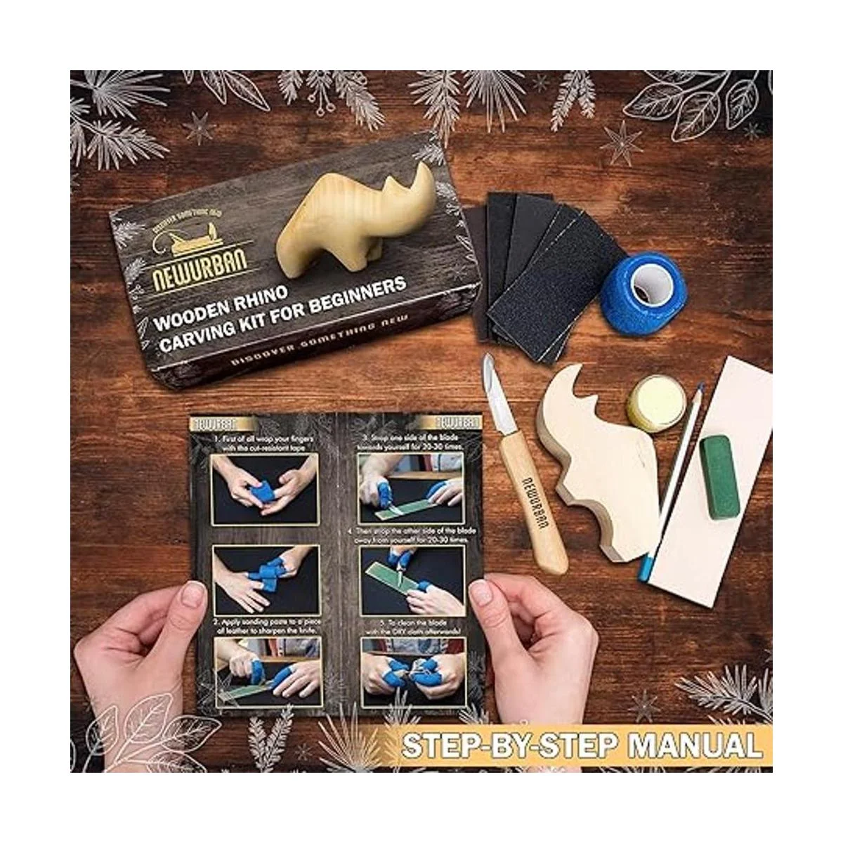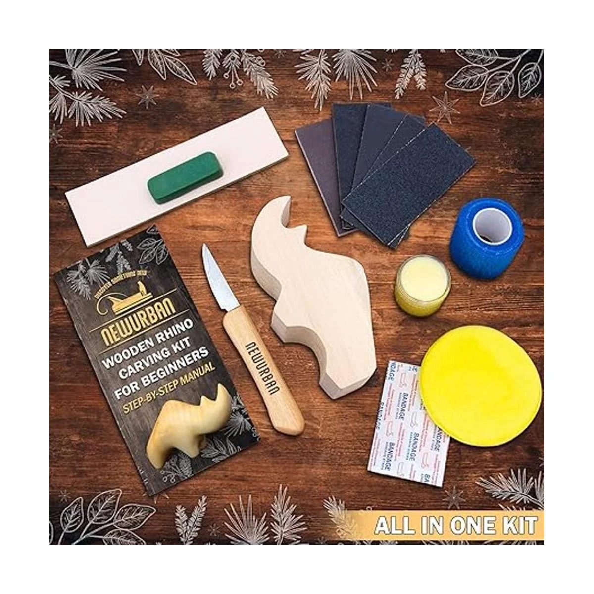 NEWURBAN Kit de tallado de madera para principiantes Kit de afilado con rinoceronte Kit de carpintería de tilo para niños y adultos Cuchillo de acero inoxidable para tallar madera con mango de madera, tilo en blanco en forma de rinoceronte