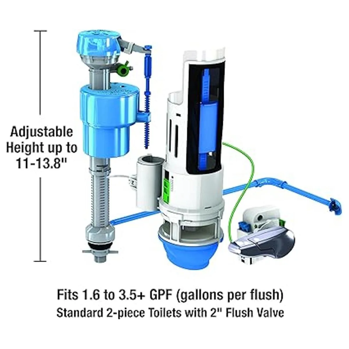 Compatibilidad: Funciona con válvulas de descarga estándar de 2 pulgadas y requiere una distancia mínima de 10 pulgadas desde el punto más alto de la apertura de la válvula de descarga hasta el interior de la tapa del depósito. No compatible con inodoros Mansfield.