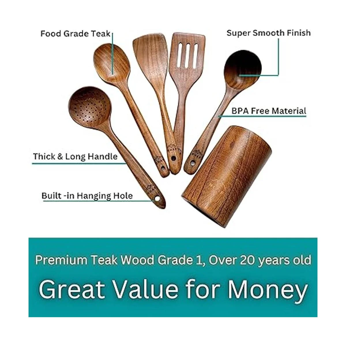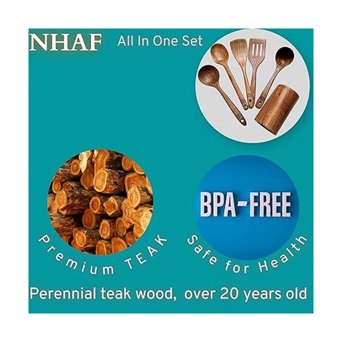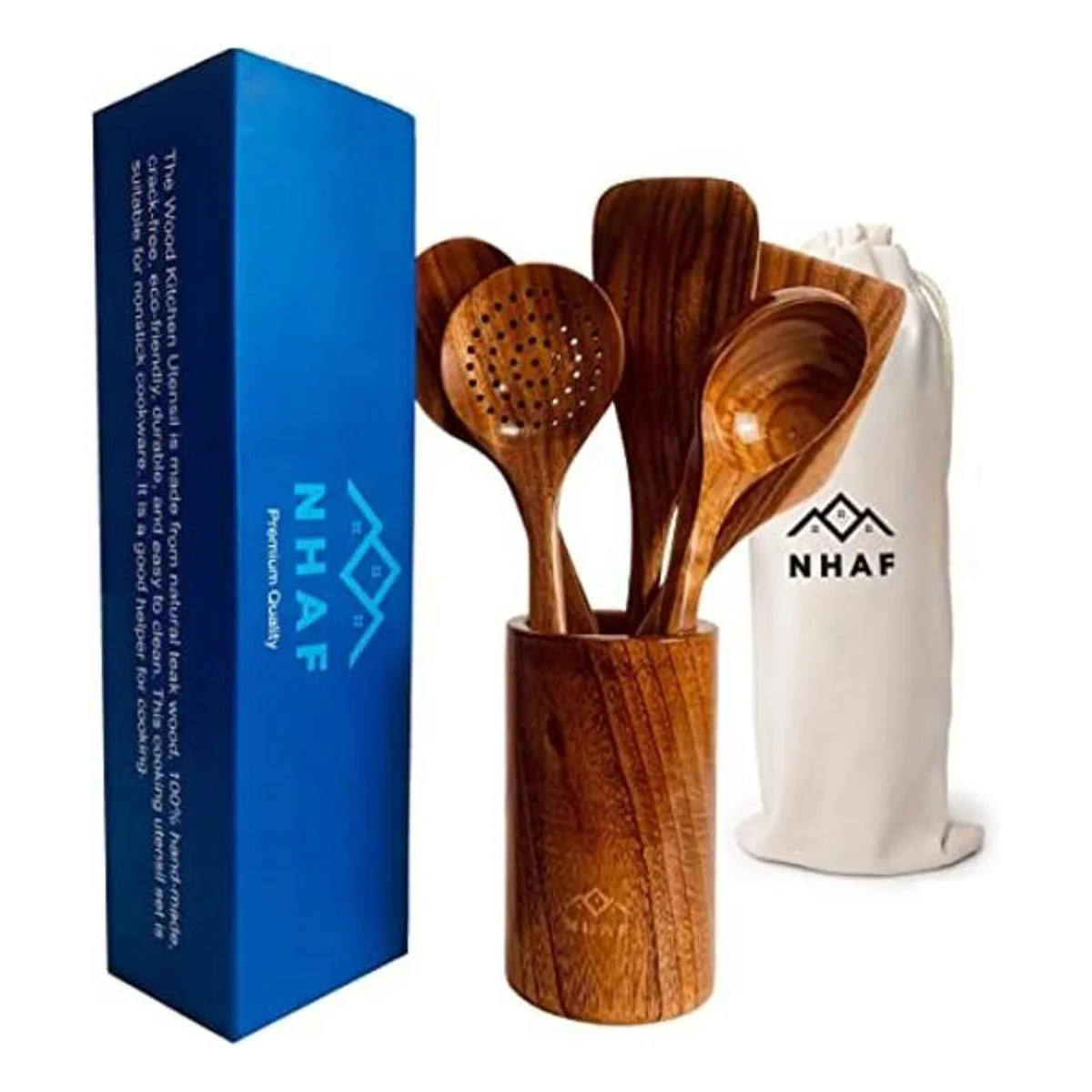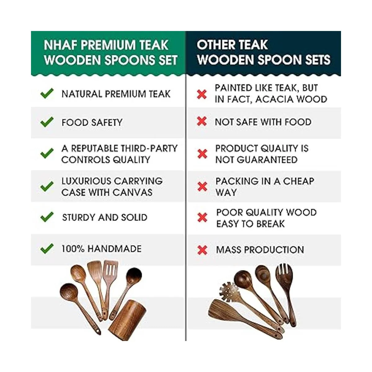 NHAF Cucharas de madera para cocinar, juego de utensilios de cocina de madera de teca prémium con soporte y bolsa de lona, cucharas de cocina de madera, cucharas y espátula, utensilios de madera duraderos para cocinar, regalo de cocina para mamá