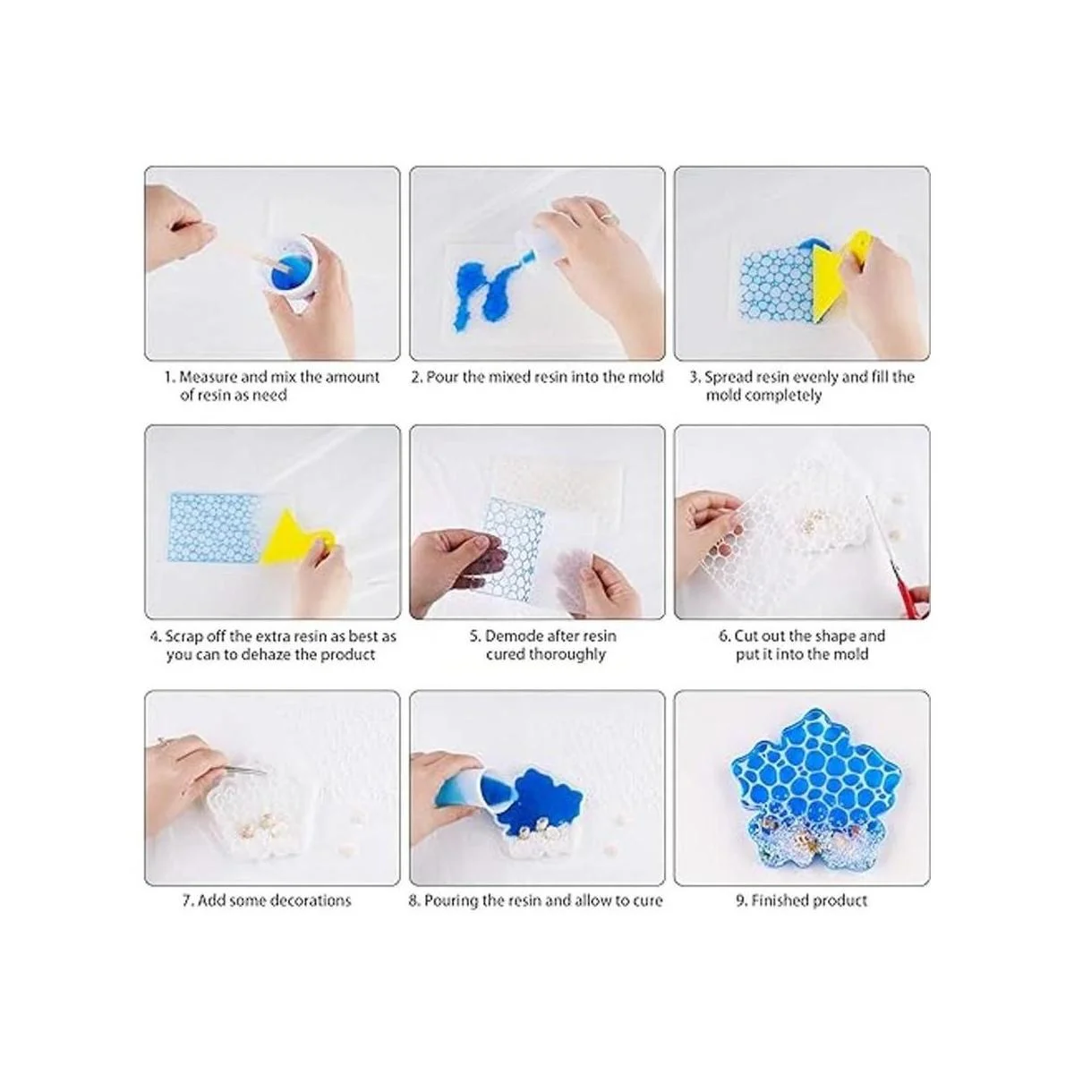Trabaja de forma segura y divertida: después de remover la mezcla de resina y endurecedor, deja reposar durante 5 10 minutos para eliminar las burbujas. No utilices una de calor o antorcha directamente en los moldes de silicona para curar la resina. Coloca un calentador de espacio o una lámpara de calor cerca de la resina para ayudar a que se seque más rápido. Cuando se trabaja con resina, sigue siempre las instrucciones del fabricante y las precauciones de seguridad. Asegúrate de trabajar en un área limpia y bien ventilada. Se requiere protección para la piel, respiratoria y ocular.