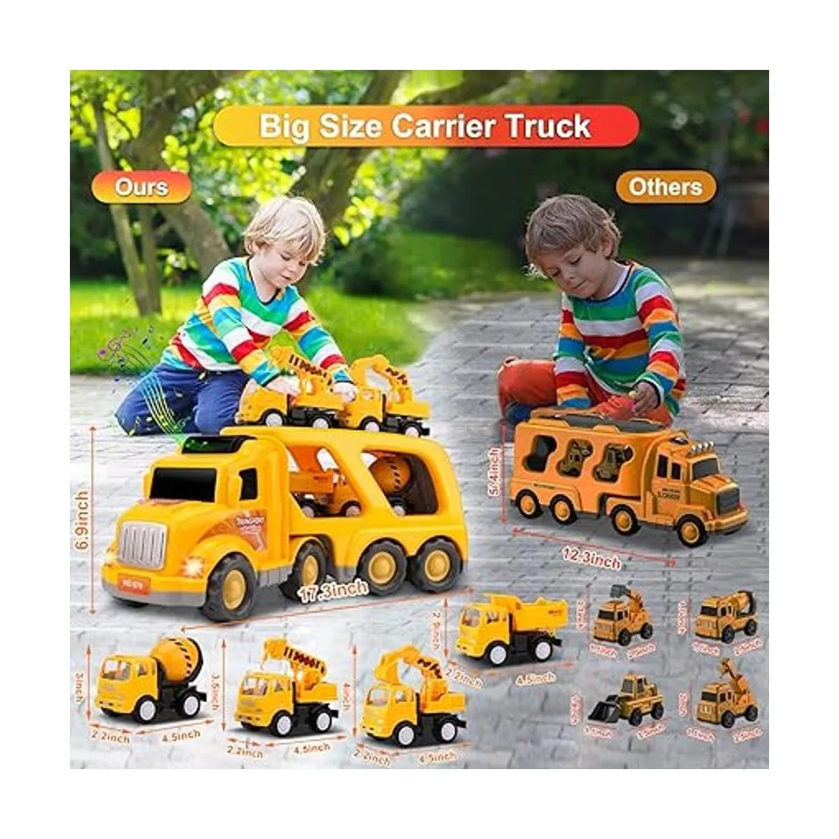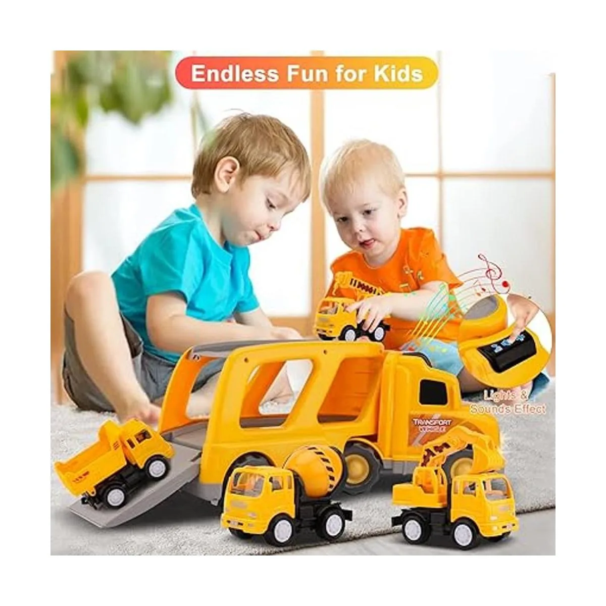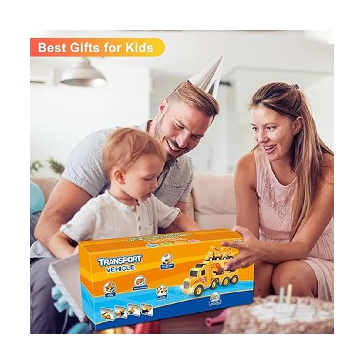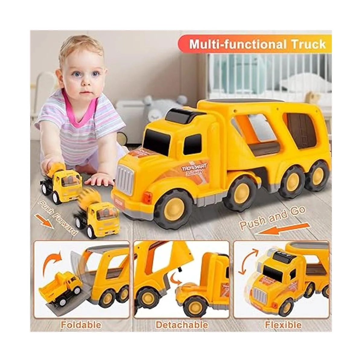 Cómo jugar: simplemente empuja el gran camión de construcción hacia adelante, correrán hacia adelante por sí mismos. Llevará cuatro mini vehículos y se pondrá en marcha Puedes separar la cabina del camión del remolque y luego abrir el portón trasero para descargar el mini vehículo. También empuja el coche pequeño hacia adelante, luego suelta tu mano, correrán hacia adelante por sí mismos. El momento feliz del juego comienza aquí. Juguetes perfectos para niños de 1 a 4 años.