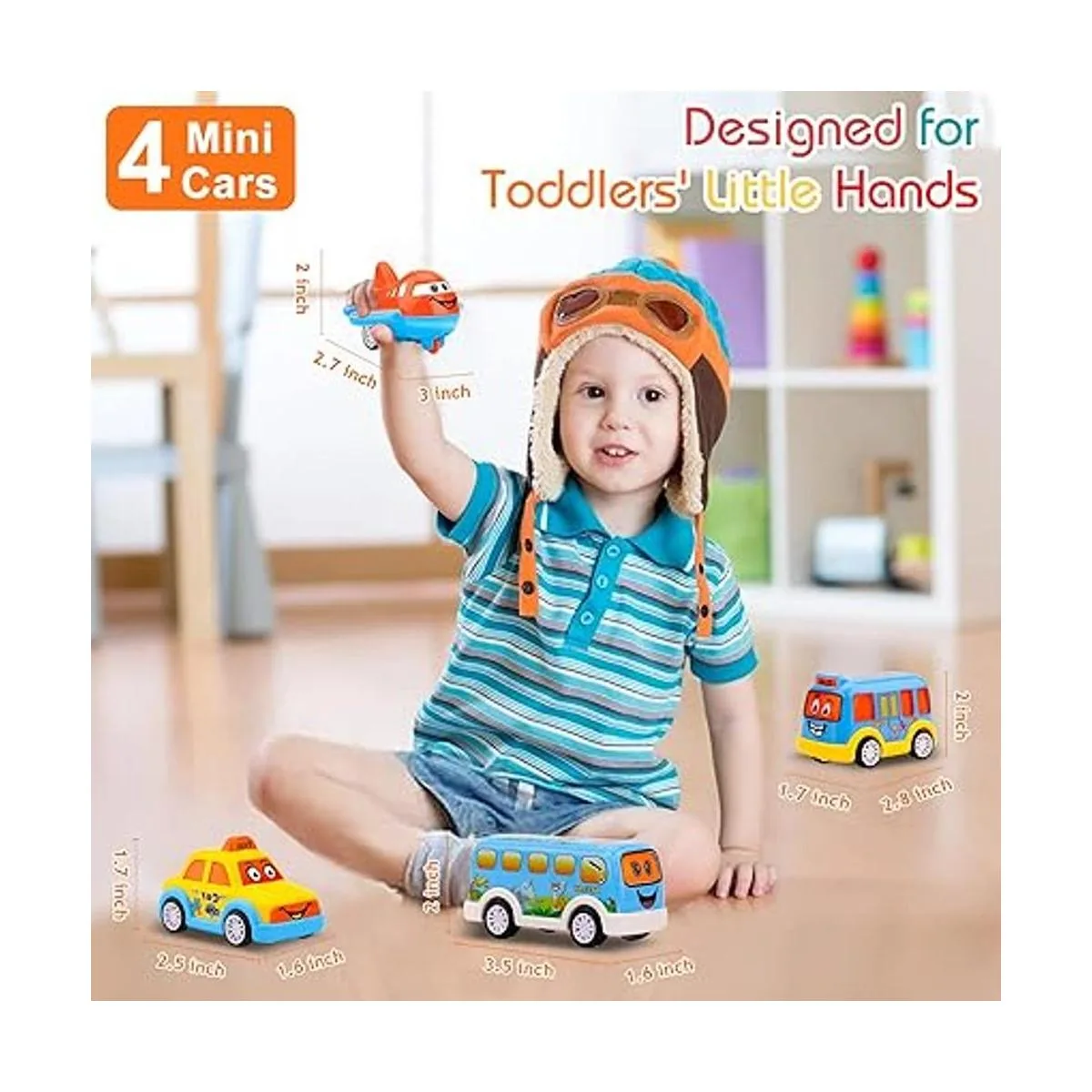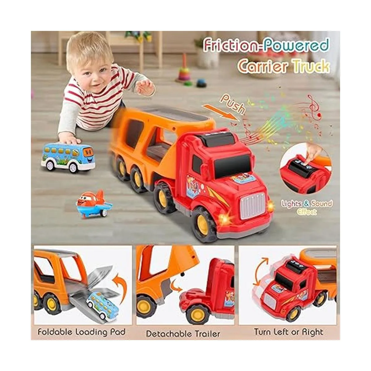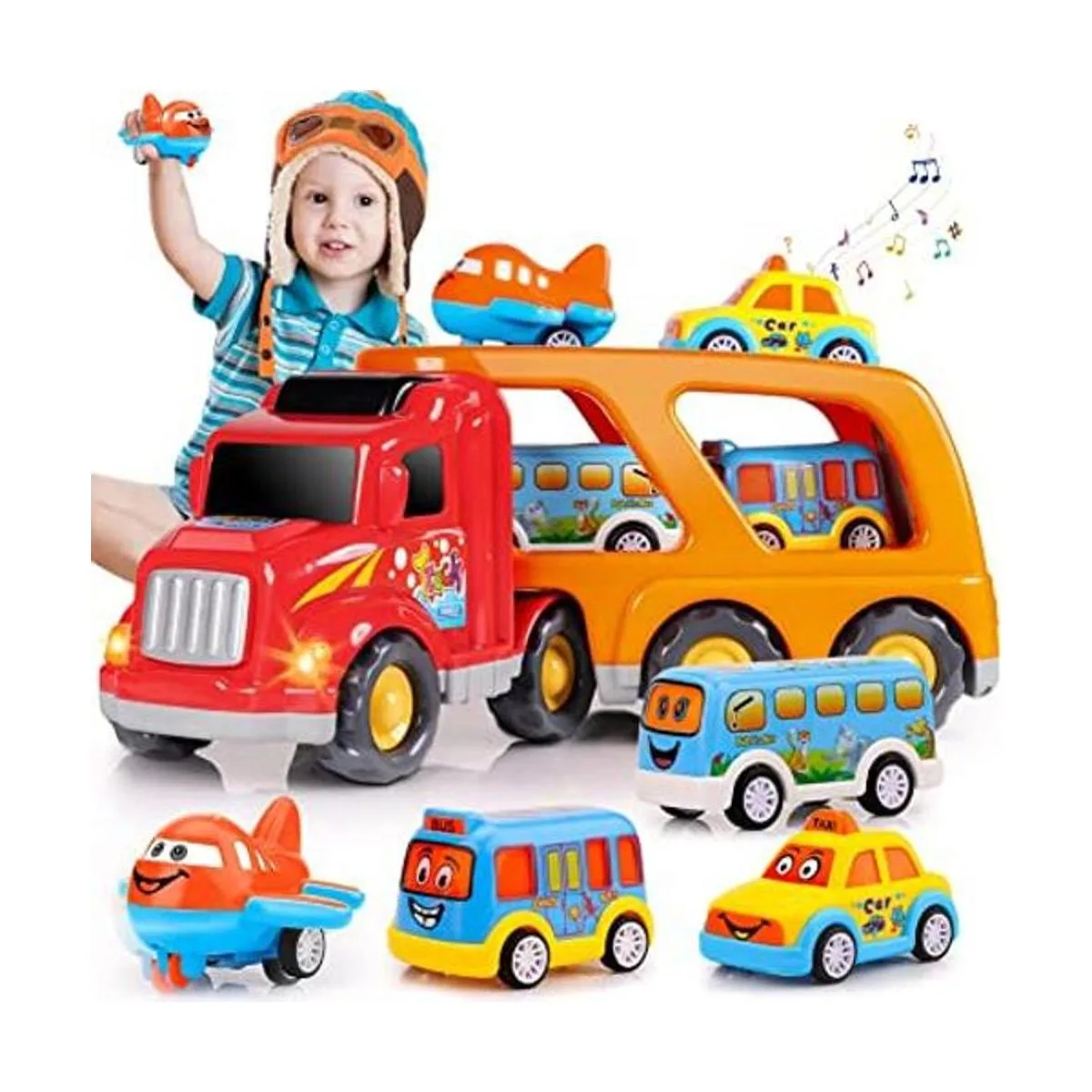 Fácil de jugar para niños pequeños Hay 2 coches de juguete de inercia hacia adelante y 3 autos de juguete. Simplemente empuja el camión de juguete grande hacia adelante, correrán hacia adelante por sí mismos. Llevará cuatro mini vehículos de juguete y se pondrá en marcha Puedes separar la cabina del camión del remolque y luego abrir el portón trasero para descargar el mini vehículo. Tira del coche pequeño hacia atrás, luego suelta tu mano, correrán hacia adelante por sí mismos. Juguetes fáciles de jugar para bebés de 12 a 36 meses.