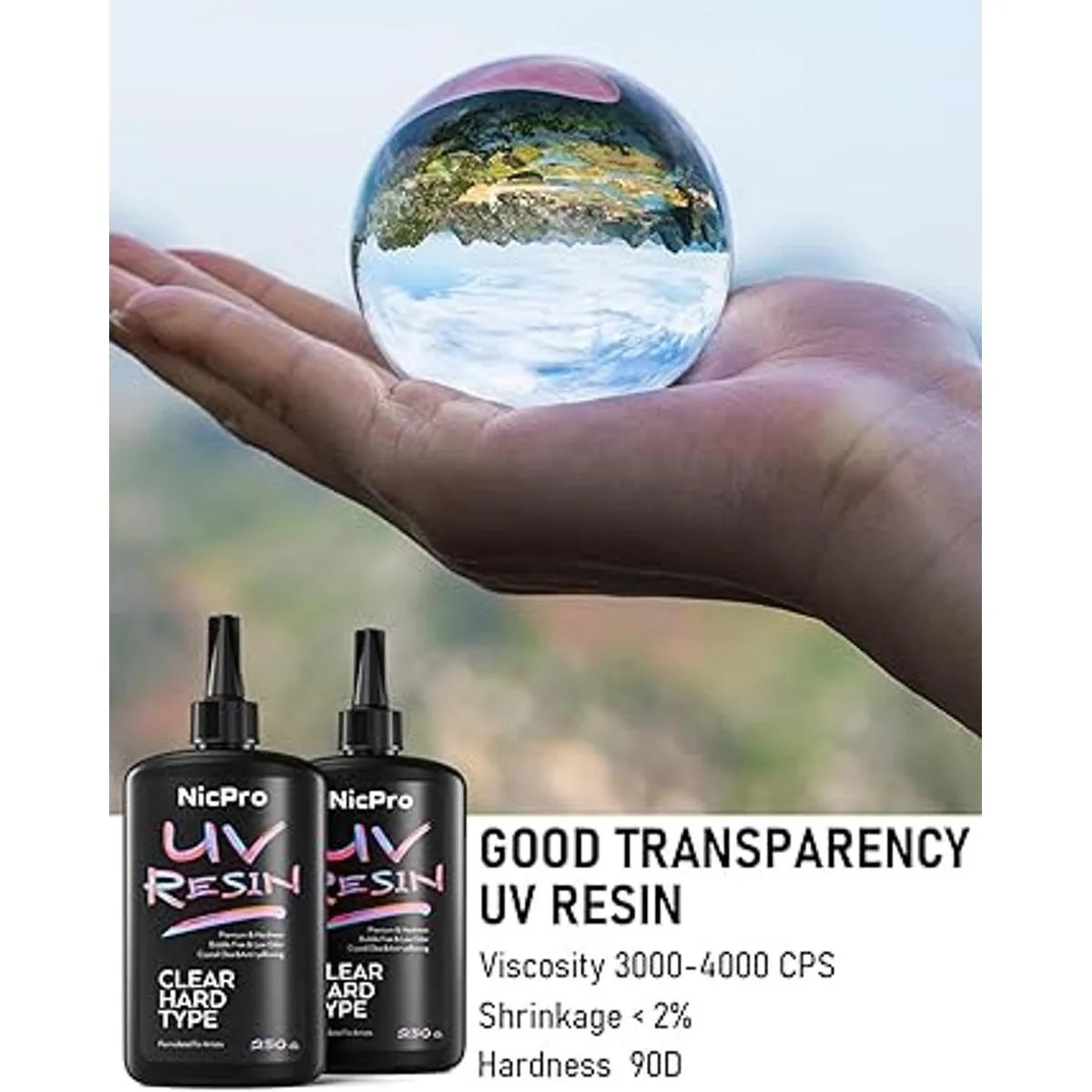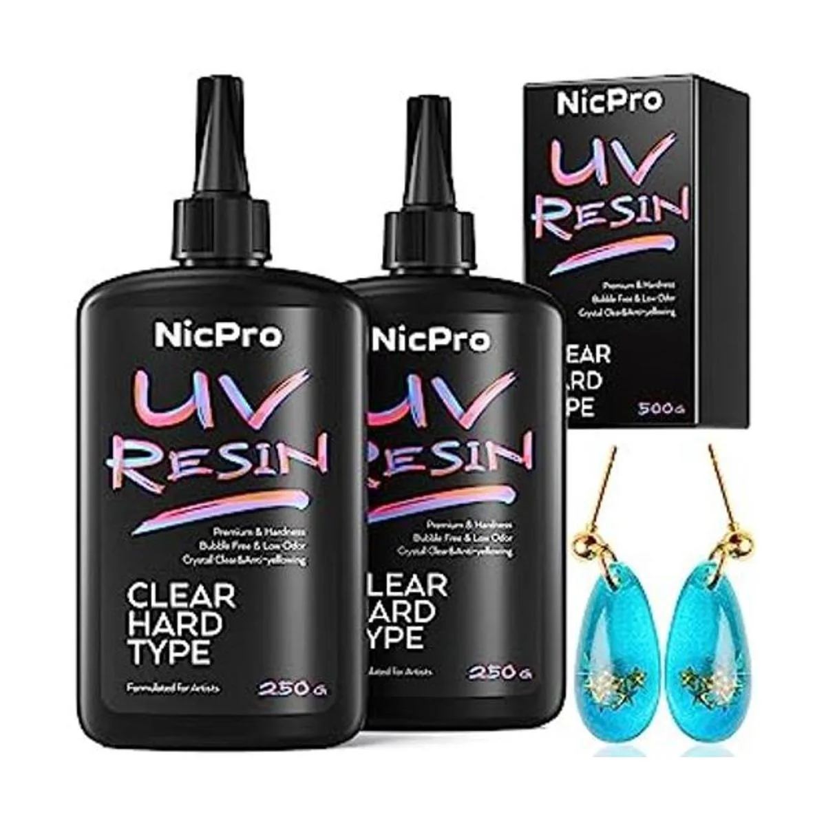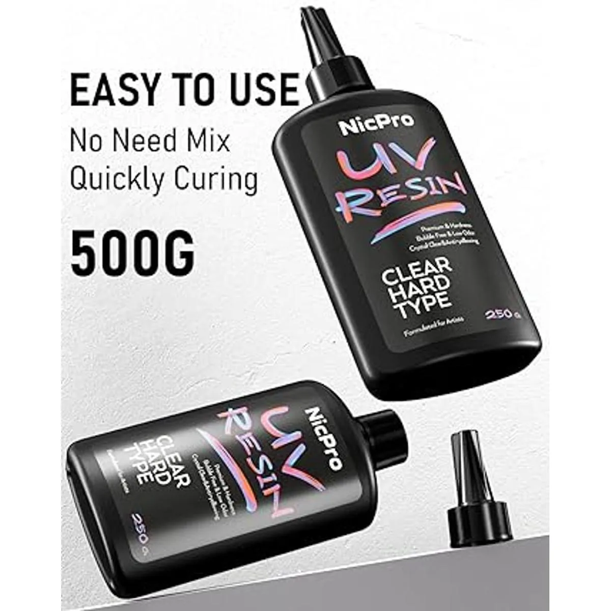 Nicpro Resina UV de 17.64 oz, 2 piezas de resina epoxi UV mejorada, no tóxica, pegamento duro transparente de bajo olor, luz solar de secado para hacer joyas, decoración de manualidades, fundición y revestimiento