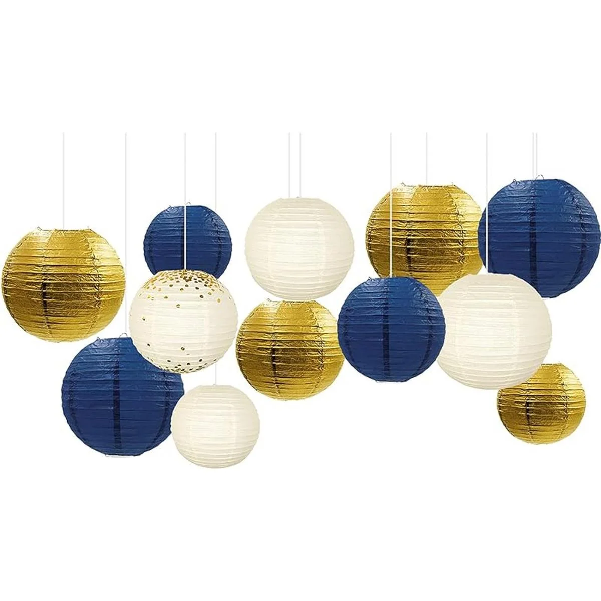 Decoraciones de graduación azules: los juegos de linternas de papel azul marino vienen con 12 linternas de papel para colgar en tu fiesta, el tamaño incluye 5 unidades de 12.0 in, 4 unidades de 10.0 in y 3 de 8.0 in.