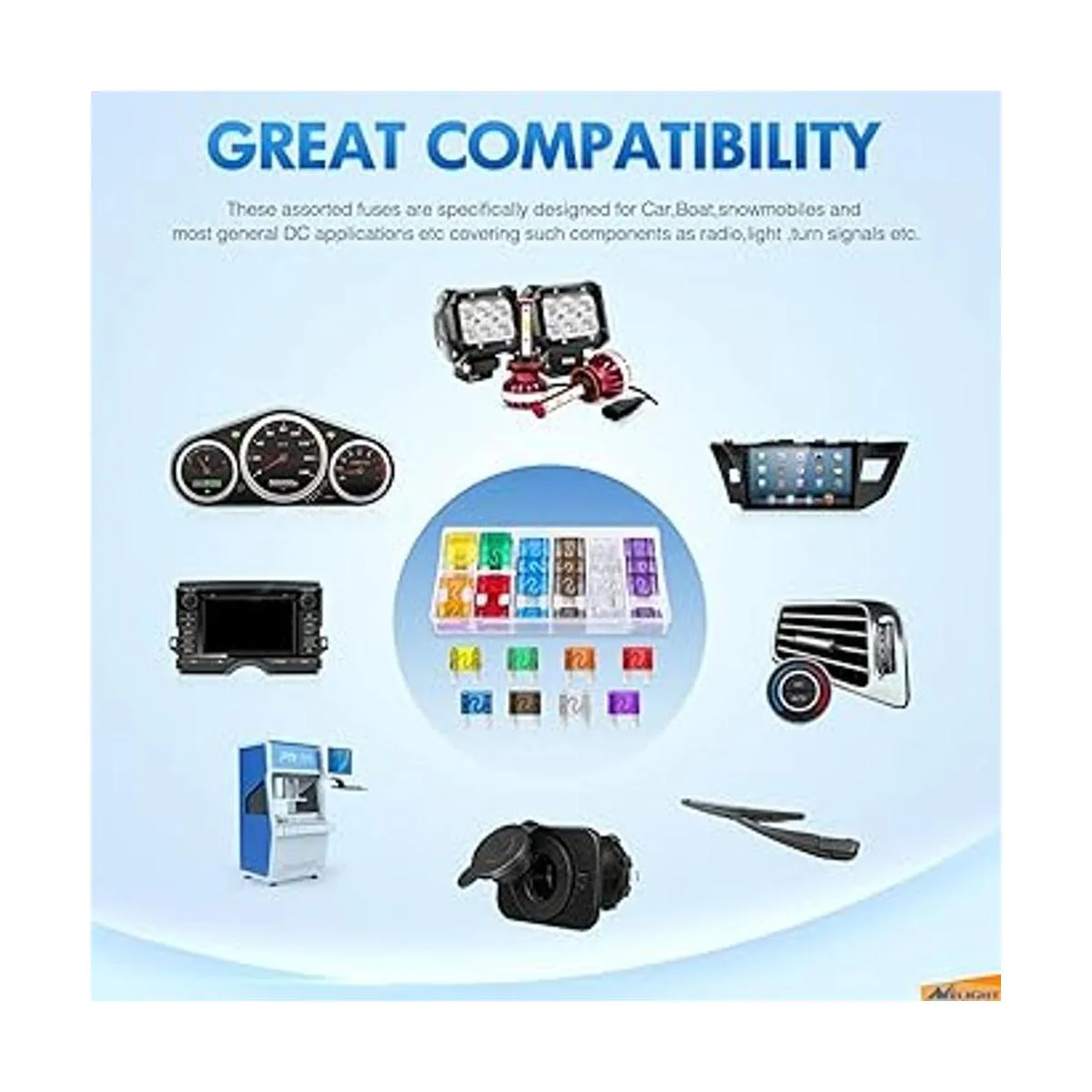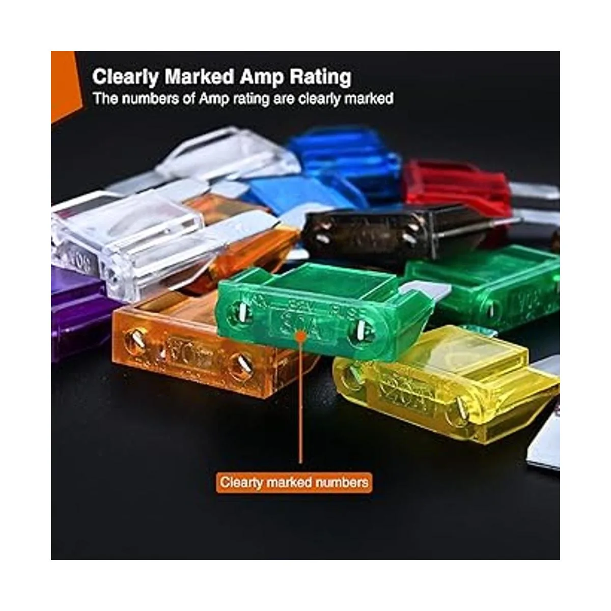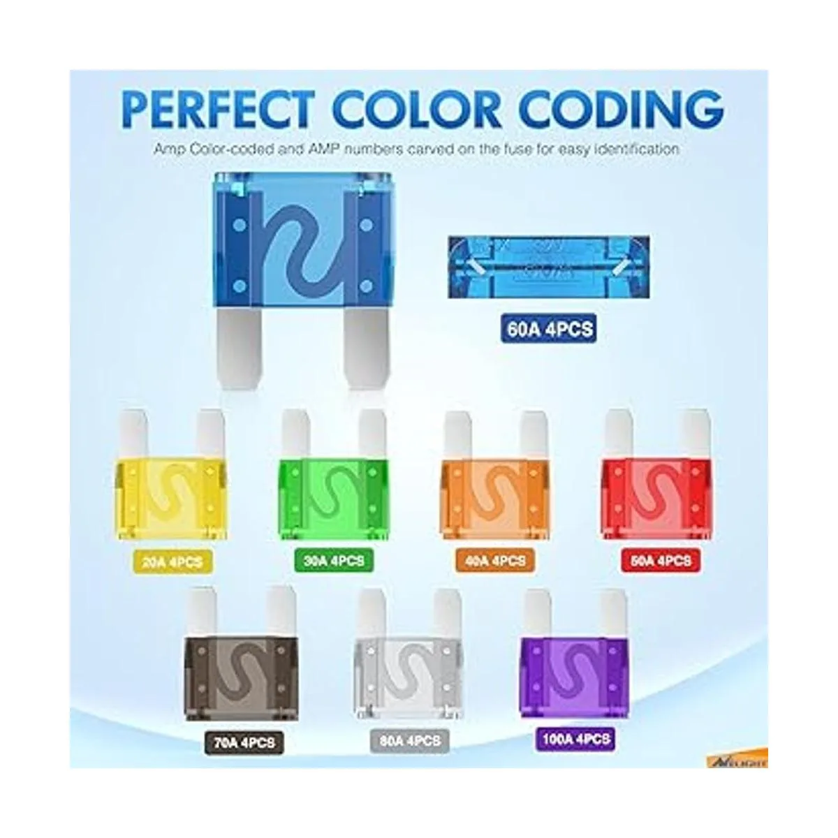 Fácil identificación: cada fusible está codificado por colores en la carcasa de plástico, y la clasificación de amplificador tallado 20A/30A/40A/50A/60A/70A/80A/100A son figuras en la parte superior de los fusibles para una fácil identificación.