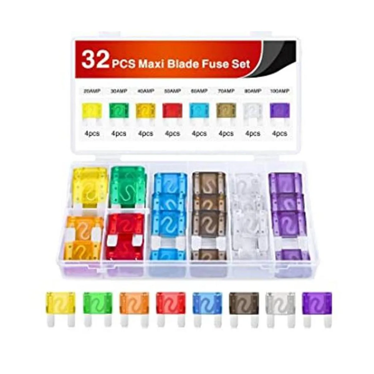 El paquete incluye: 32 fusibles de hoja de 8 tamaños. Incluye fusible de hoja maxi APX de 20 A, 30 A, 40 A, 50 A, 60 A, 70 A, 80 A, 100 A