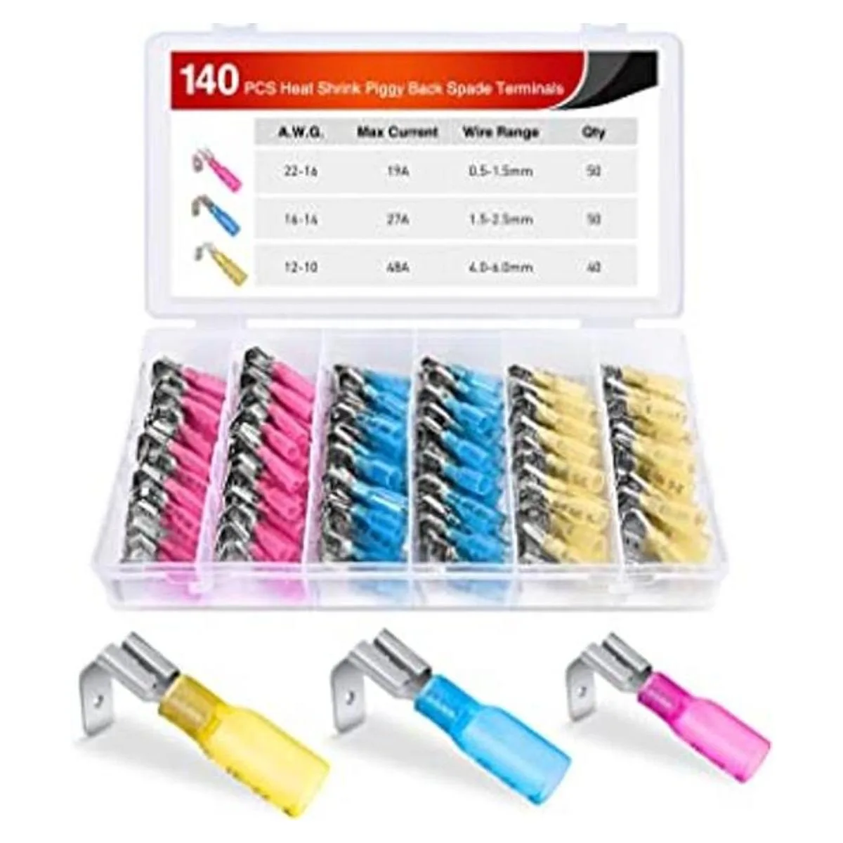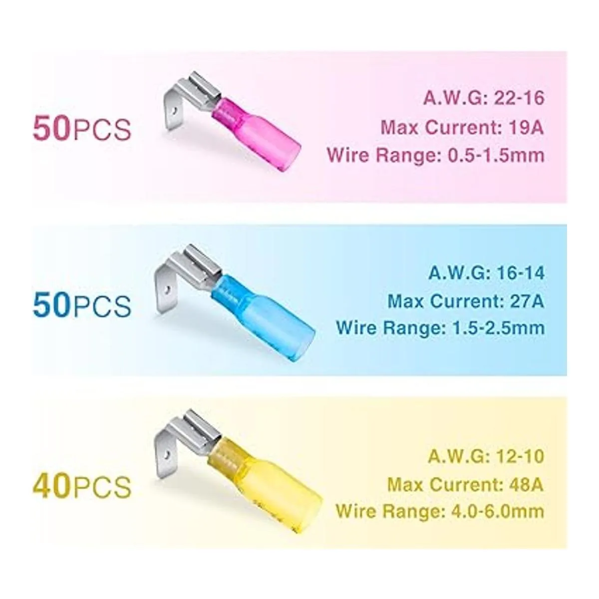 El paquete incluye: 140 terminales de pala termorretráctiles. Rojo: 50 unidades; azul: 50 unidades; amarillo: 40 unidades.