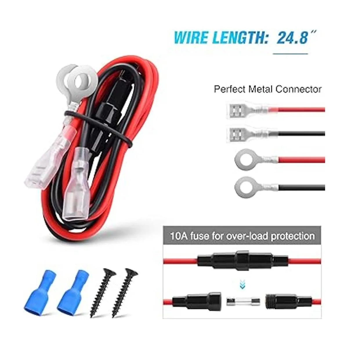 El paquete incluye: 2 paquetes de encendedor de cigarrillos para coche, 4 terminales aislados, 4 tornillos, 2 cables negro/rojo con 10 Afuse