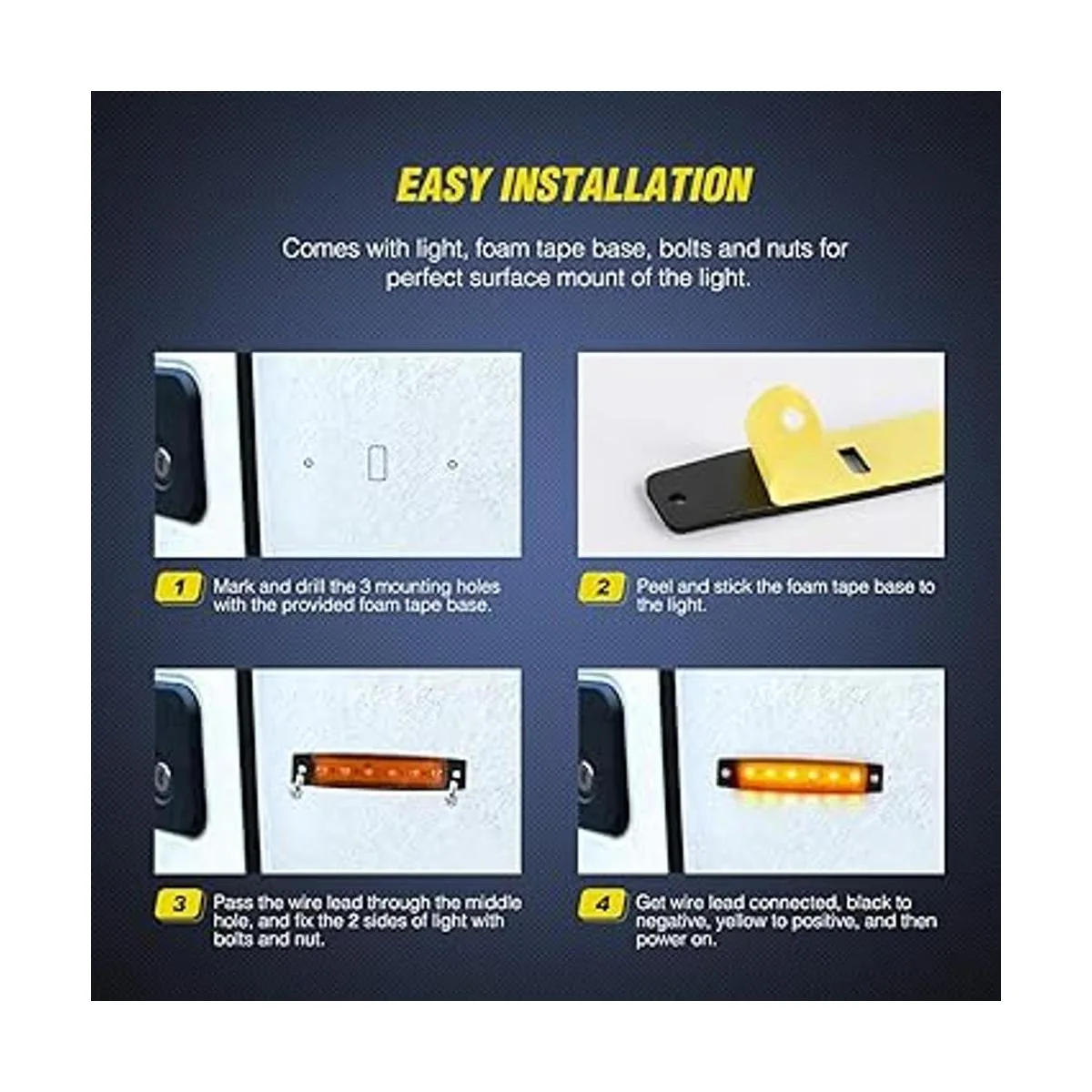 Instalación sencilla: conexión de 2 cables, amarillo/rojo para positivo, negro para negativo. 3 pasos de montaje ligero: marca y taladra agujeros de acuerdo con la base de cinta de espuma proporcionada; pela y pega la cinta de espuma a la luz; pasa a través del cable hasta el agujero central y utiliza pernos y tuercas para fijar 2 lados. El agujero central puede no ser necesario si utiliza alguna arandela debajo de la base de cinta de espuma al fijar los dos lados