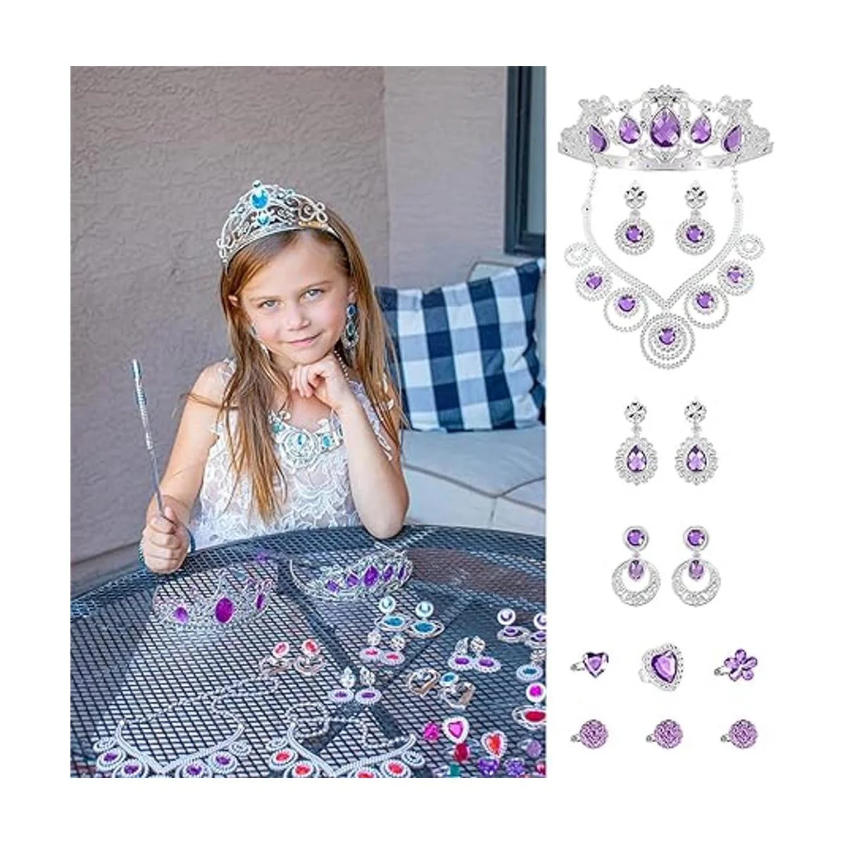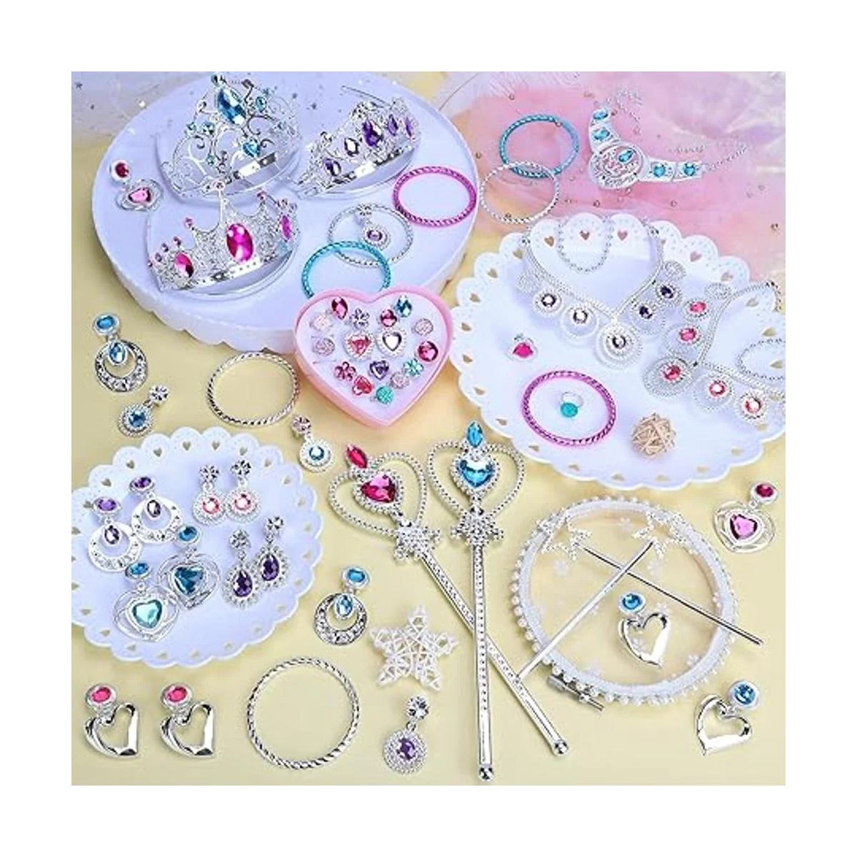 Realiza el sueño de princesa: con diseños surtidos, nuestro juego de juguetes de princesas puede hacer que tu niña se convierta en una princesa única. Material plástico de diamantes de imitación, brillante y hermoso. Disfruta de nuestro juego de joyas de princesa, cumple el sueño de princesa de tu niña.
