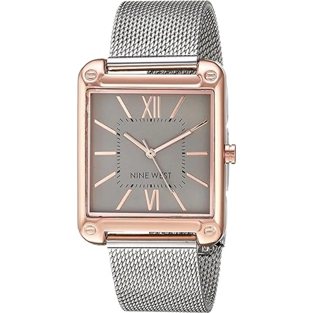 Nine West Reloj de pulsera de malla con esfera de rayos solares para mujer, PlateadoOro rosa