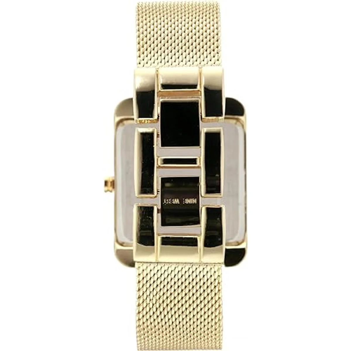 Esfera champán claro con manecillas e indicadores dorados; pista de minutos interior impresa en negro