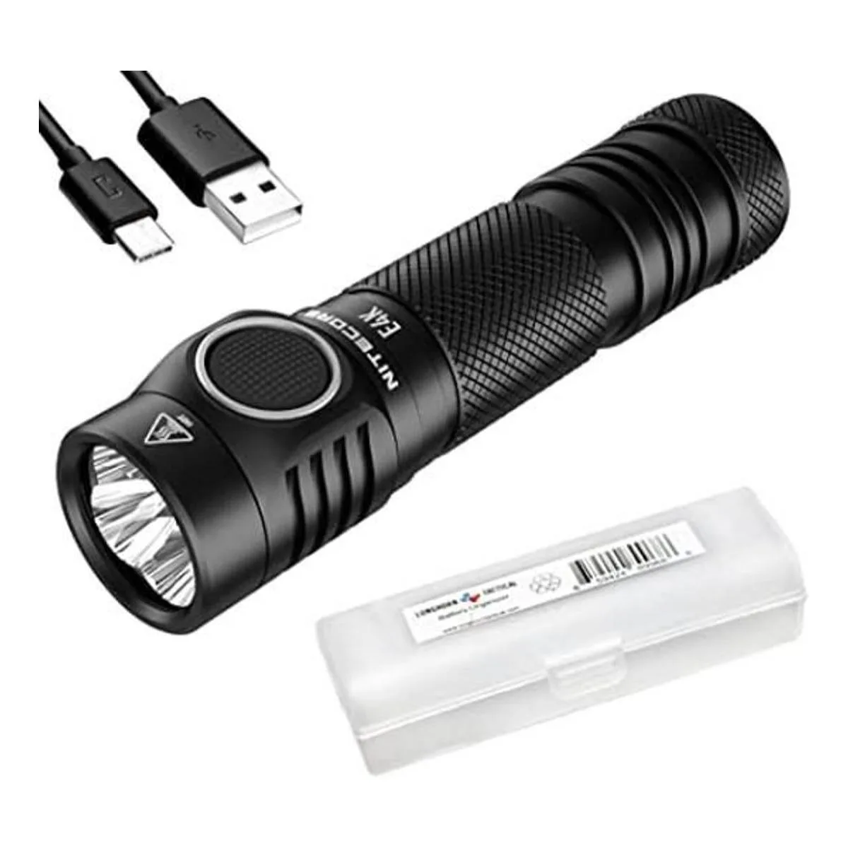 Incluido en este paquete: una nueva linterna NITECORE E4K NL2150HPR preinstalada, cable de carga USBC, clip de bolsillo de metal bidireccional, funda, cordón y funda de almacenamiento LumenTac.