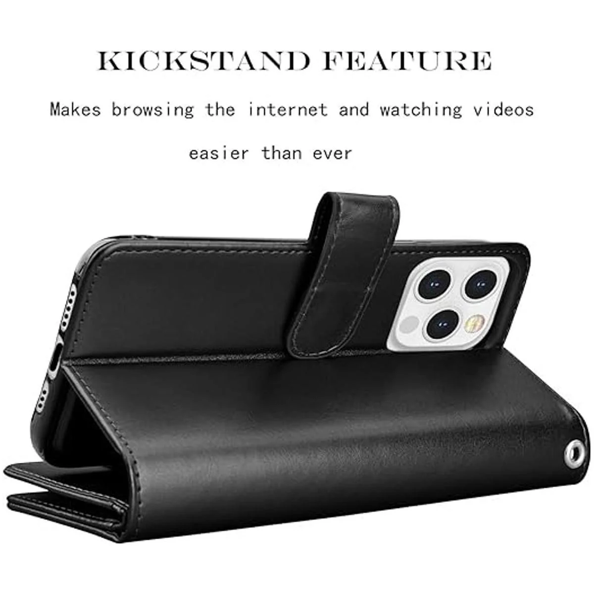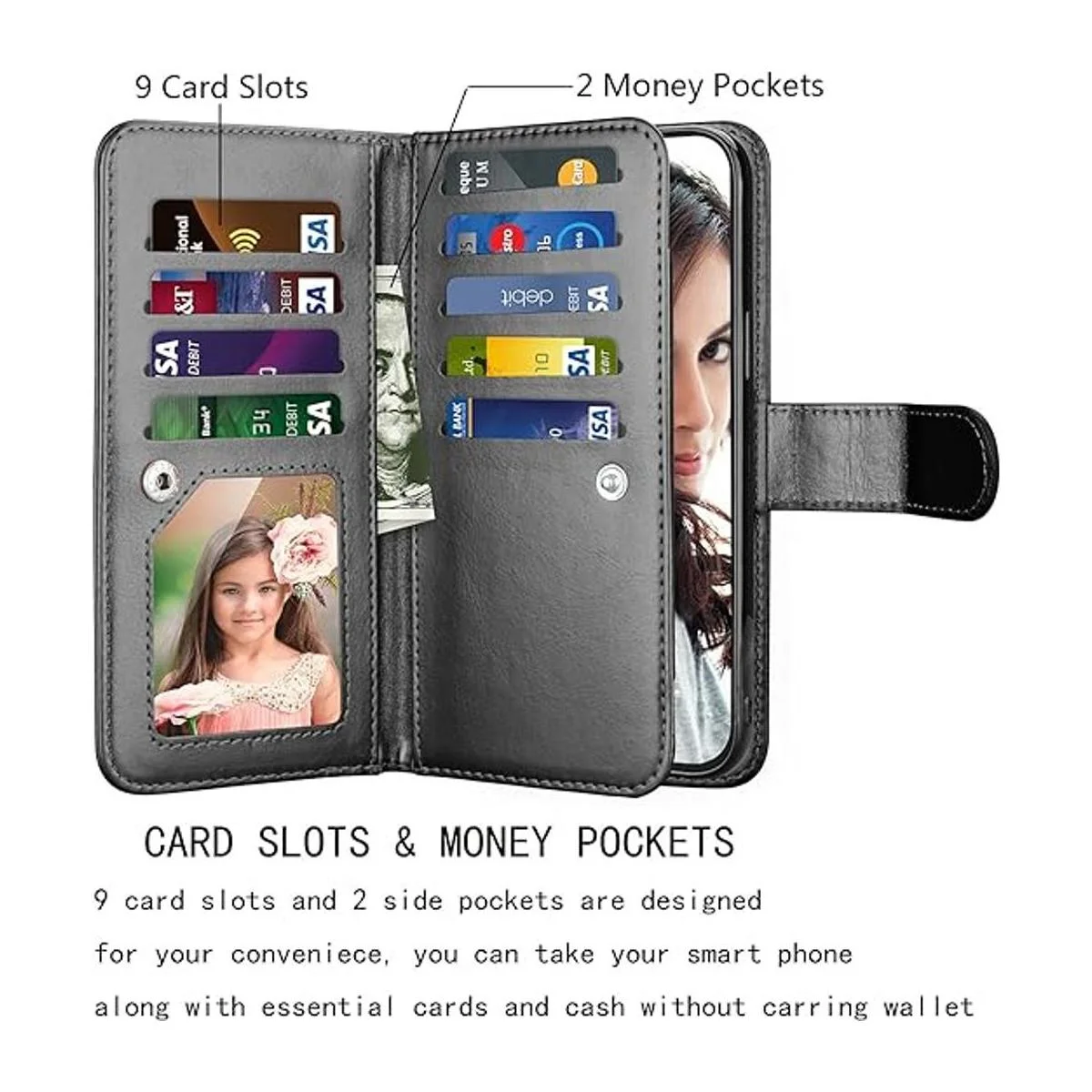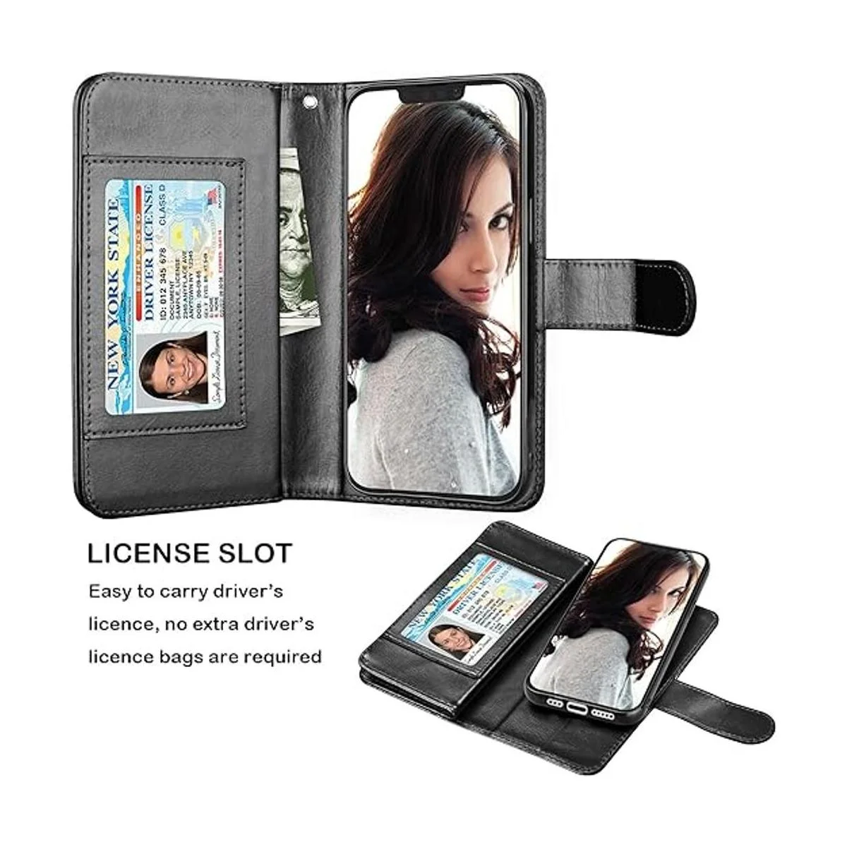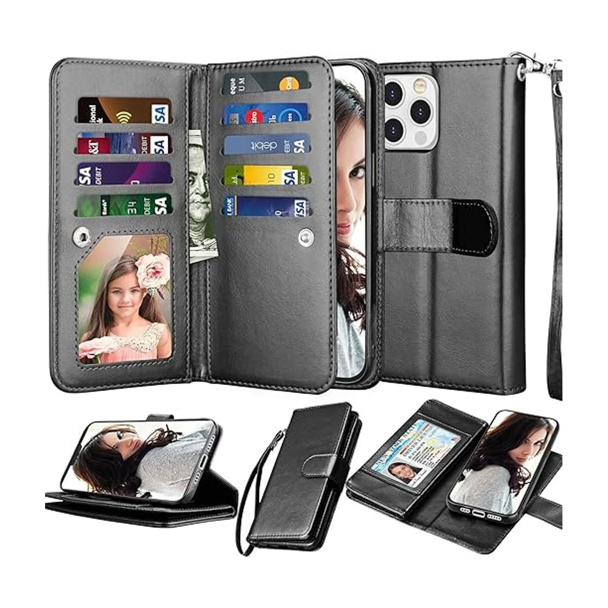 Njjex Compatible con iPhone 13 Pro Max iPhone 13 Pro Max Funda tipo cartera de 6.7 pulgadas 2021, 9 ranuras para tarjetas de piel sintética con tapa abatible desmontable Funda magnética para teléfono y cordón Negro