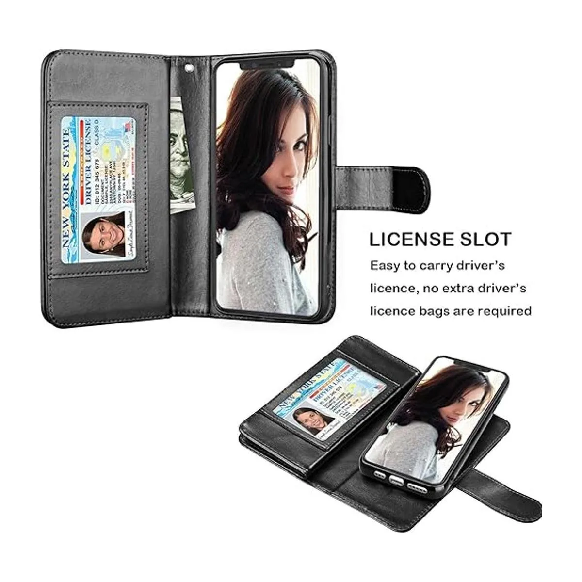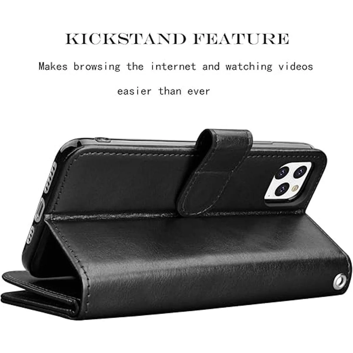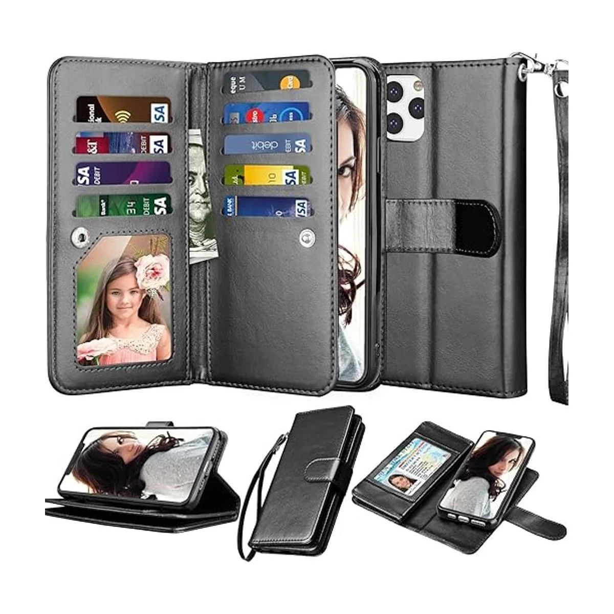 Njjex Funda tipo cartera para iPhone 11 XI, para iPhone 11 6,1, 9 ranuras para tarjetas PU de cuero para identificación de crédito, tapa extraíble con función atril magnético para iPhone 11 2019, color negro