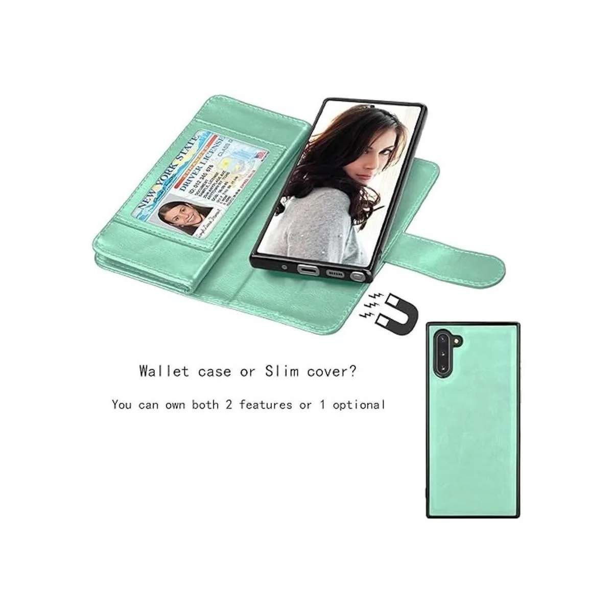 Njjex Funda tipo cartera para Samsung Galaxy Note 10, para Galaxy Note 10 2019 9 ranuras para tarjetas de piel sintética para identificación de crédito, con tapa extraíble soporte de soporte magnético para teléfono y cordón menta