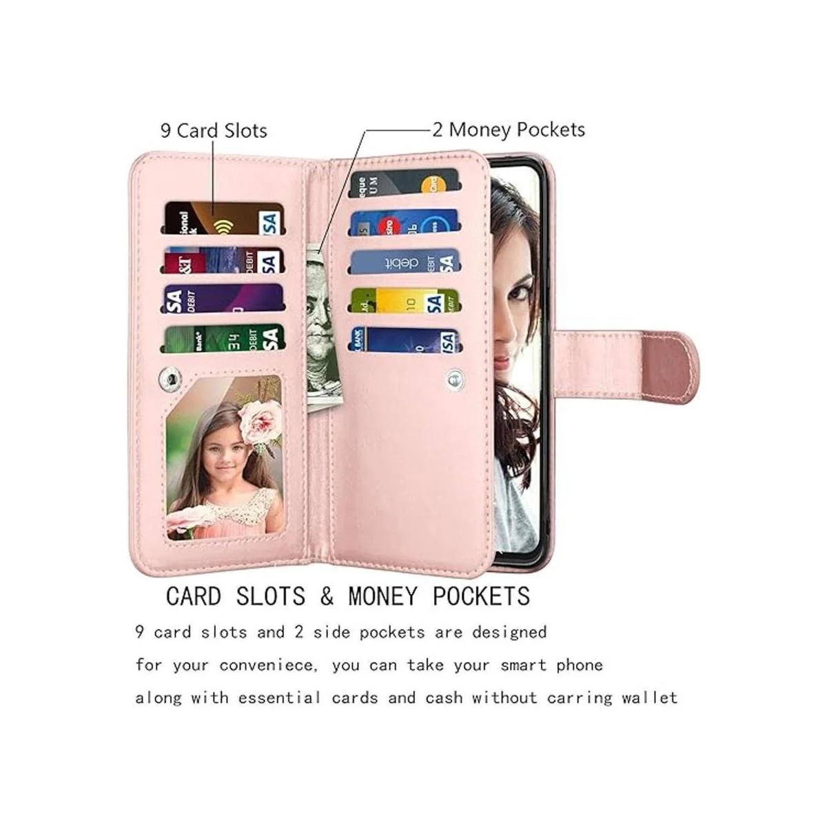 Njjex Funda tipo cartera para Samsung Galaxy S21 Plus 5G, para Galaxy S21 Plus de 6.7 pulgadas, 9 ranuras para tarjetas Soporte de crédito de piel sintética con tapa abatible desmontable Funda magnética para teléfono y cordón Oro rosa