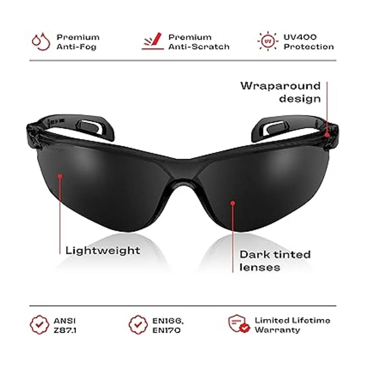 Ligero y extremadamente cómodo. Estas gafas de seguridad tintadas para hombres y mujeres tienen un marco flexible y envolvente diseñado para adaptarse bien. Las lentes tintadas oscuras de categoría 3 hacen que nuestros lentes de sol para hombre sean perfectos para la luz solar brillante o condiciones de nieve.