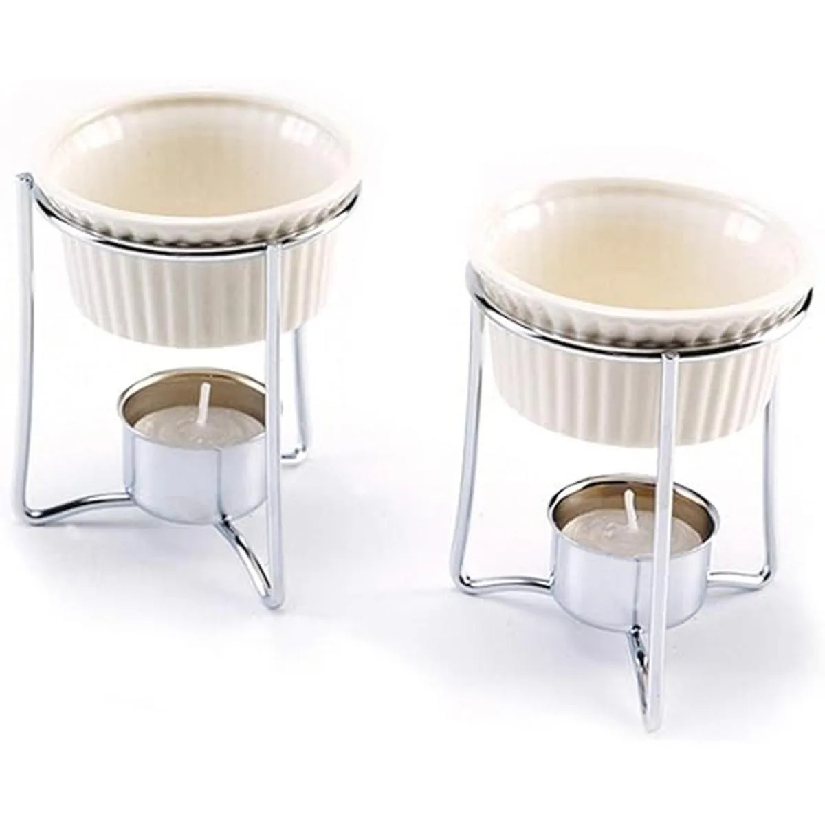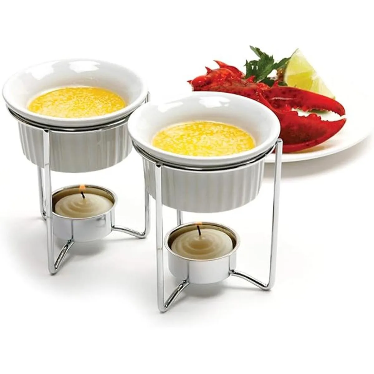 El juego incluye dos soportes de acero inoxidable, dos mantequeras de cerámica y dos velas de té.