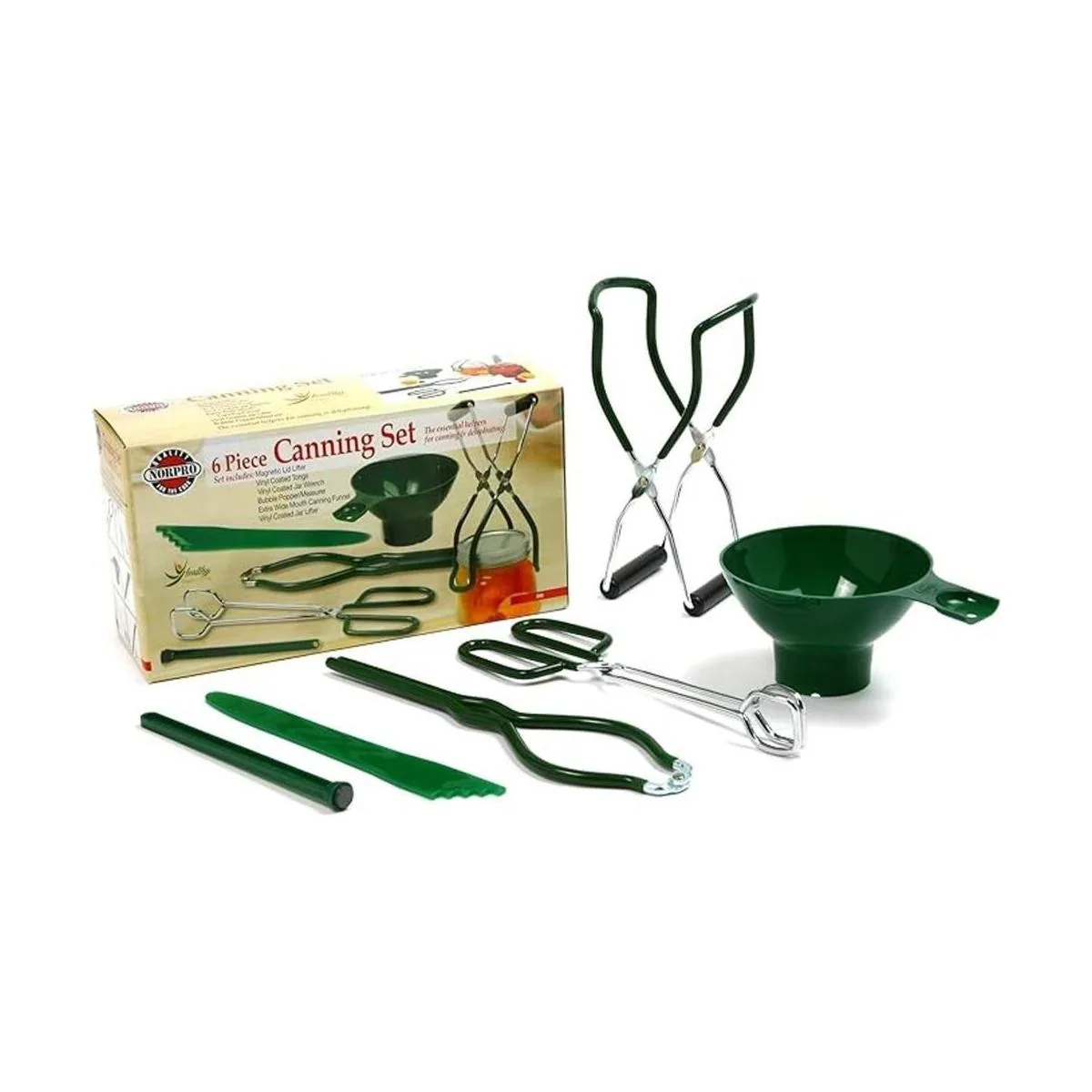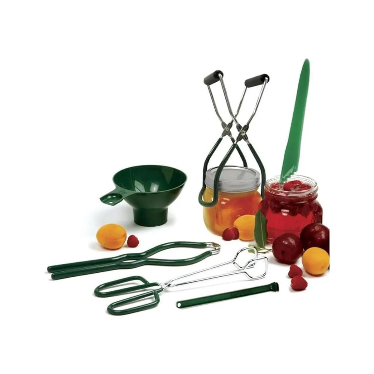Incluye: Pinzas largas con asas revestidas de vinilo verde. Levantador de tarros con revestimiento de vinilo. Levantador de tapa magnético Embudo de boca extra ancha. Llave de tarro recubierta de vinilo. Pulidor de burbujas ver descripción del producto a continuación para más información sobre cada pieza incluida.