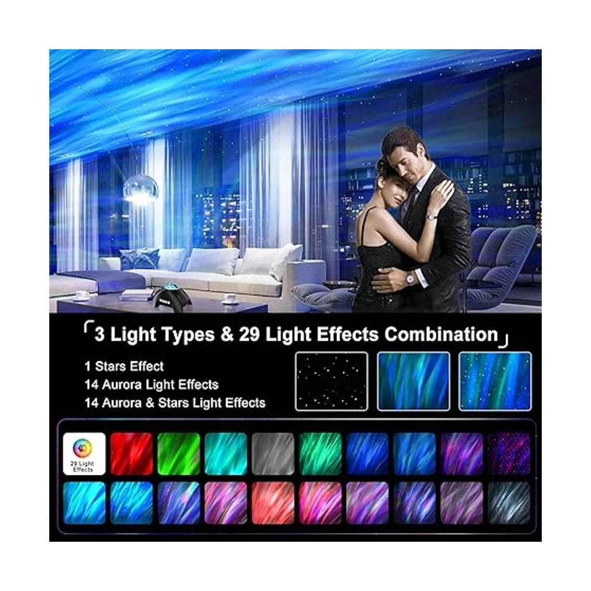 Proyector de estrellas Aurora 3 en 1 mejorado: el proyector de estrellas Vinwark para dormitorio se ha actualizado a la versión 3 en 1 de proyector de estrellas, altavoz Bluetooth y máquina de ruido blanco. Equipado con lente de proyección mejorada, el área de proyección puede alcanzar 300950 pies cuadrados. Con 29 efectos diferentes de luz del norte, puedes personalizar el efecto de luz, brillo, velocidad y ambiente relajante. Imagina que tu sala de estar fluye con coloridas luces del norte como si estuvieras en nebulosas, misteriosas y sorprendentes.