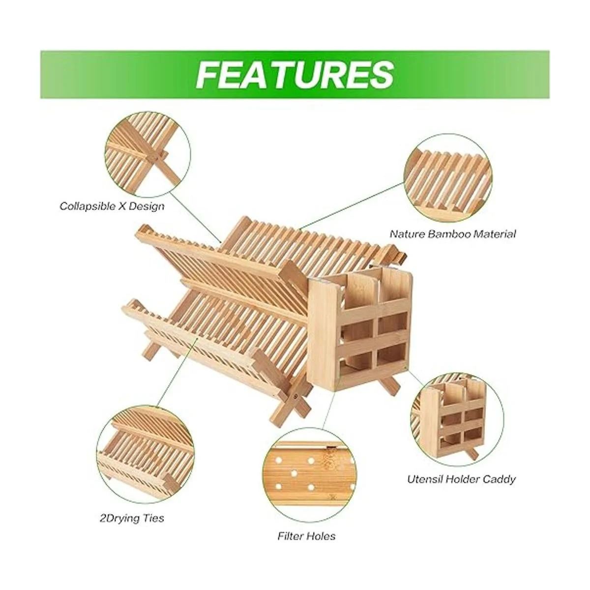 NOVAYEAH Escurridor de platos de bambú de 2 niveles, pequeño estante plegable con soporte para utensilios, escurridor de madera para encimera de cocina, soporte para platos de cocina esencial para apartamentos, organización de cocina